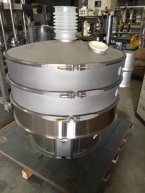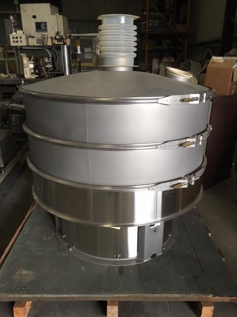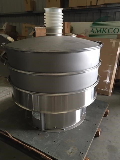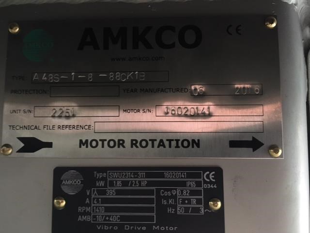 48 Inch Amkco Single deck vibrating separator. Full stainless steel 304 construction on all wetted parts with a glass bead finish. Currently setup as a whey separator, complete with infeed antifoaming device, Built in CIP, self cleaning kit assembly, and stainless steel dust cover. Ideal for use in a dairy application or a similar food environment. Currntly setup with a 325 MG 43 micron opening stainless steel bonded screen. Comes complete with a spare screen. Used to screen liquid or powders this, this is the ultimate in sanitary designed screener technology. In stock ready for shipping.