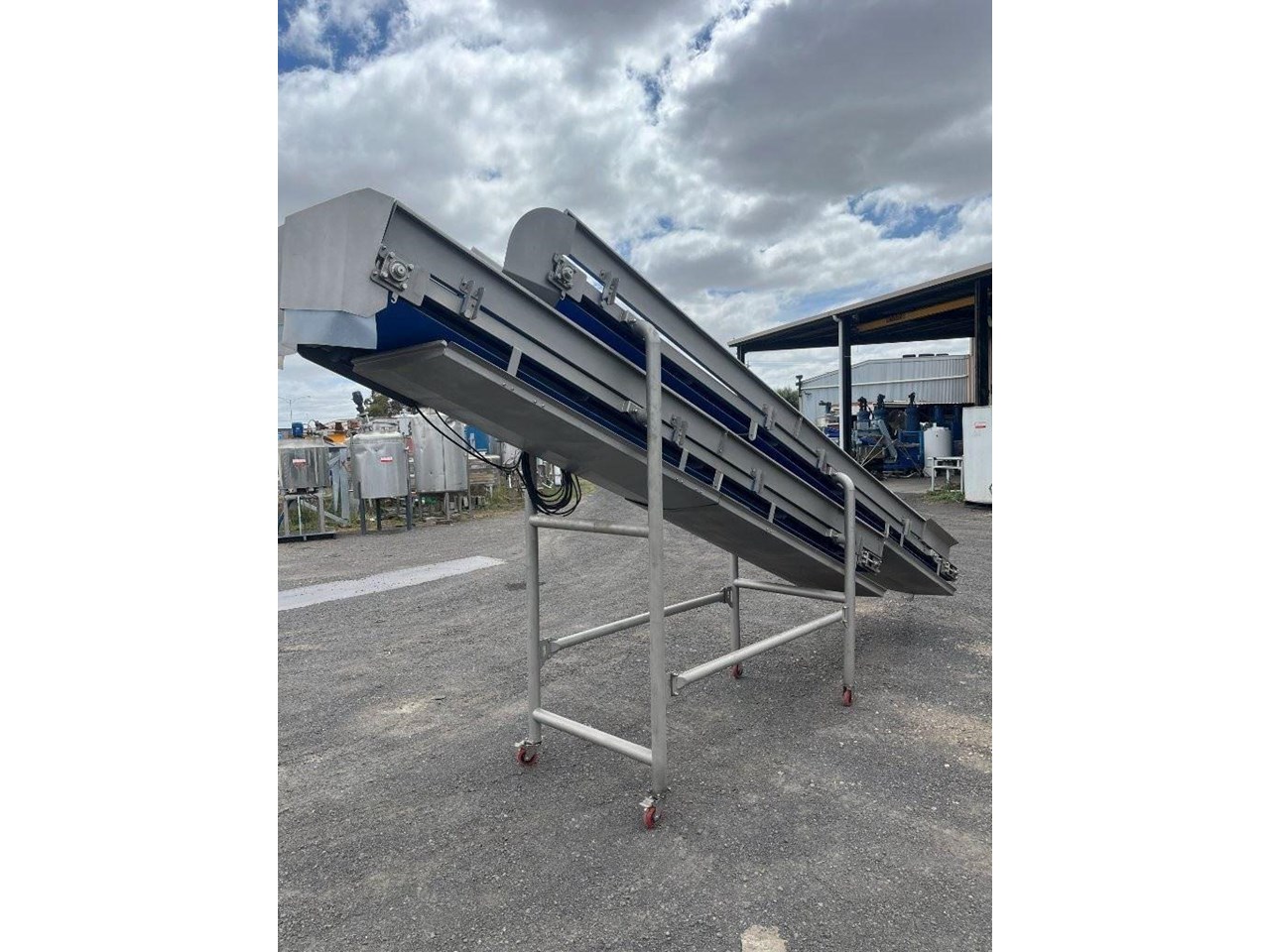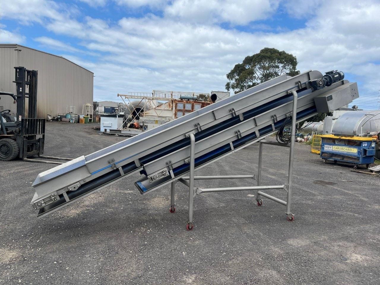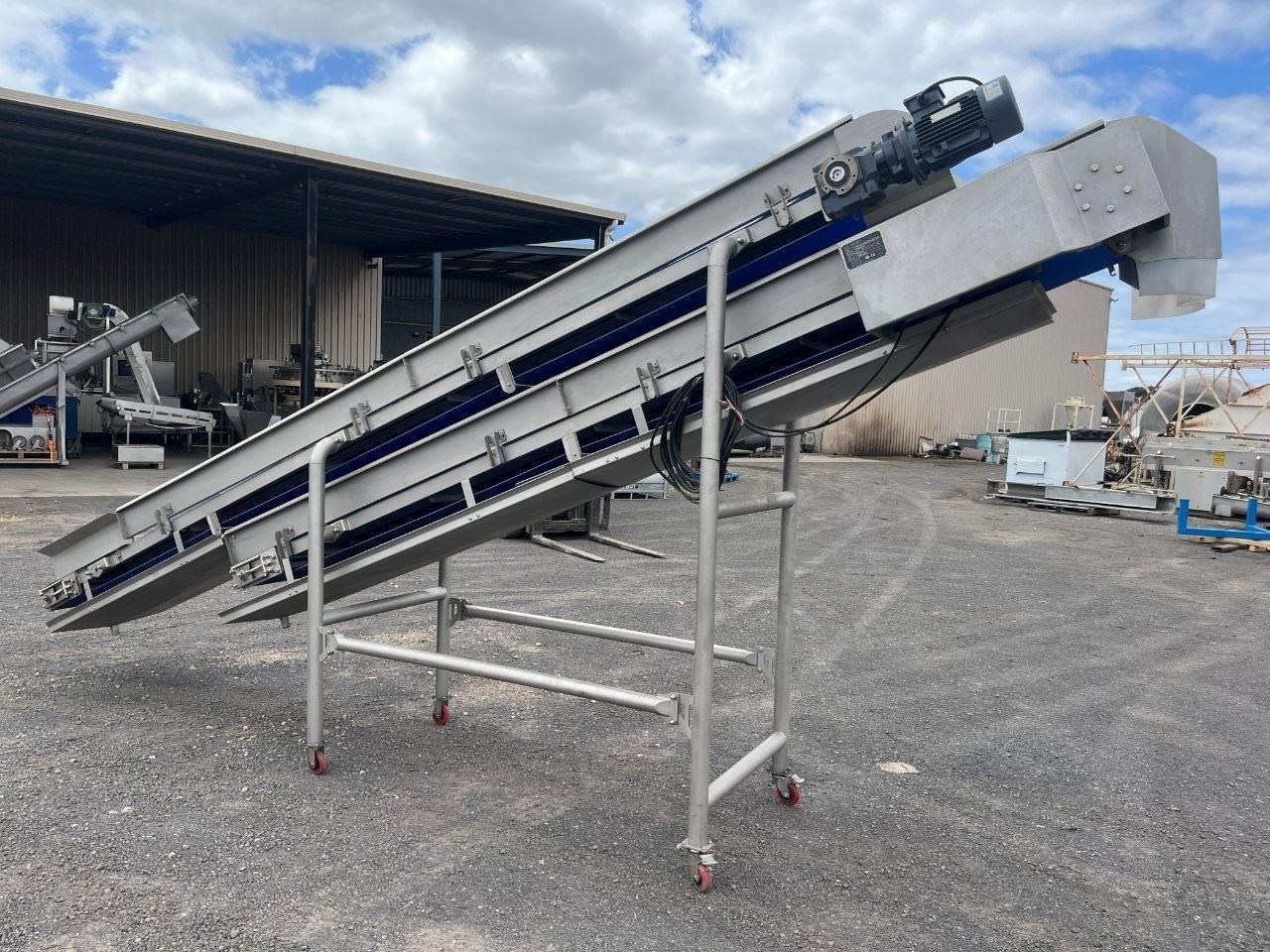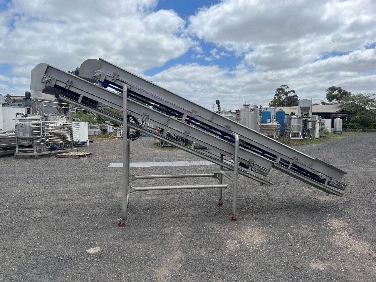 Unused stainless steel incline trough conveyors with food grade belt. 2 Conveyors currently mounted together. Conveyors can be purchased together or seperately. Top conveyor will be removed from bottom and new legs will be fabricated. Top conveyor specifications: 4.5 Metres long 580mm wide 3 Phase, 415V, 1.69A, 0.75kW, 50Hz Seimens gearmotor 1440/91.6RPM Belt speed 35M/min Food grade belt Stainless steel sidewalls Stainless steel drip tray underneath Conveyor can be used in an incline or flat position if required. Bottom conveyor specifications: 3.8 Metres long 580mm wide Bottom of conveyor belt 850mm high Discharge height 2300mm 3 Phase, 415V, 3.5A, 1.5kW, 50Hz Seimens gearmotor 1440/46.9RPM VSD Compatible with 30W cooling fan Belt speed 17.8M/min Food grade belt Stainless steel sidewalls Mounted to a ss frame with caster wheels for manouveribilty