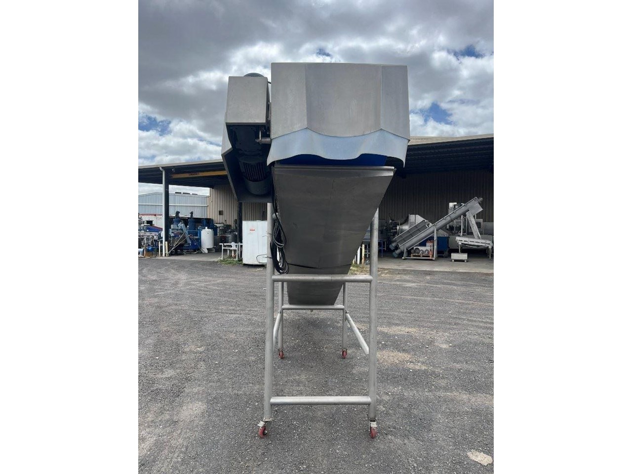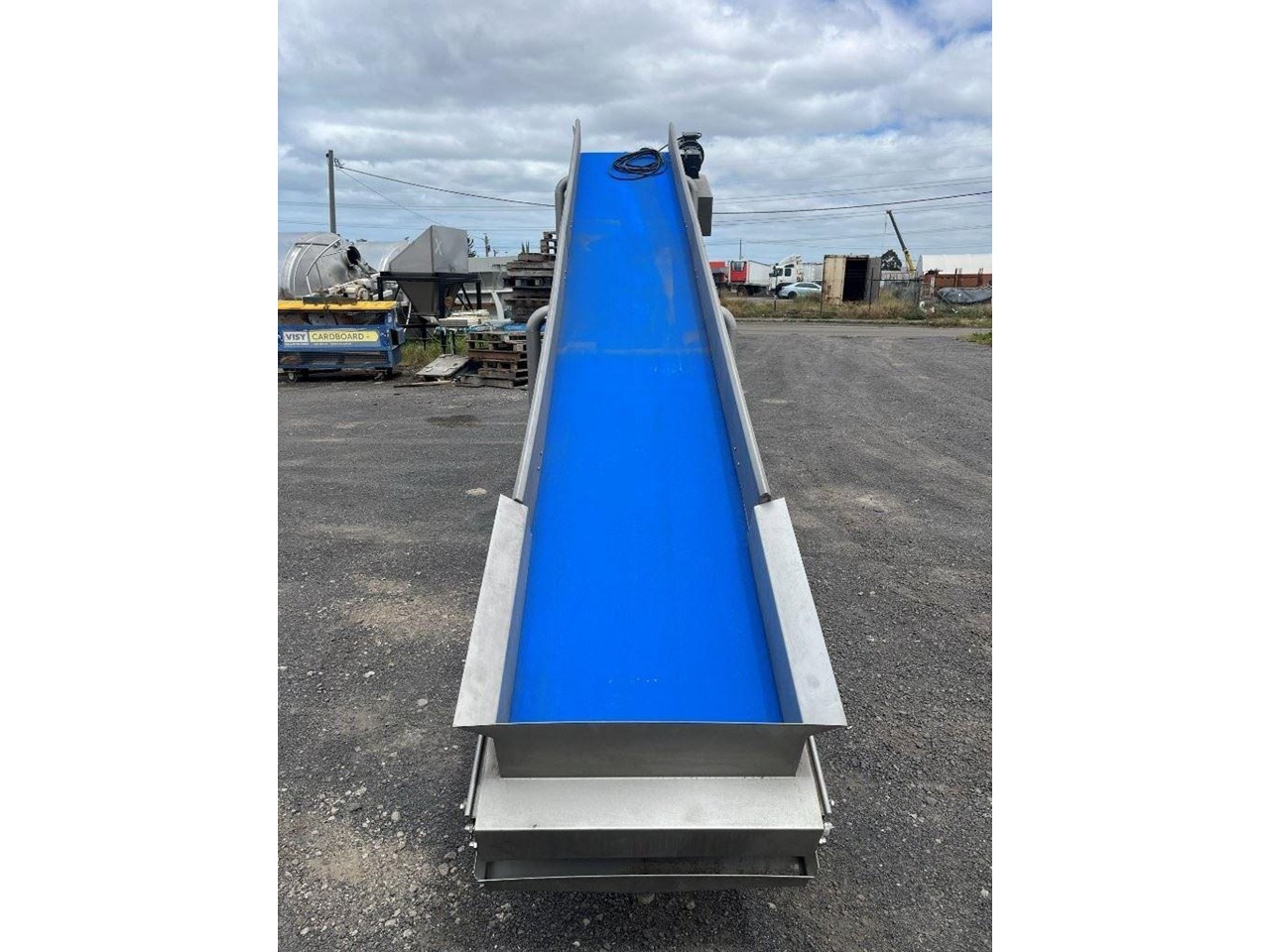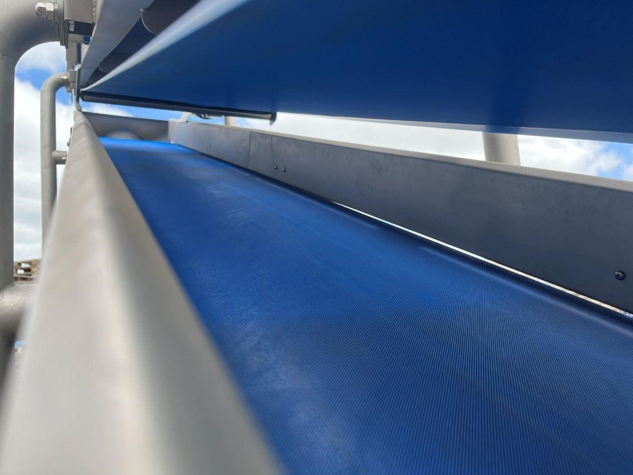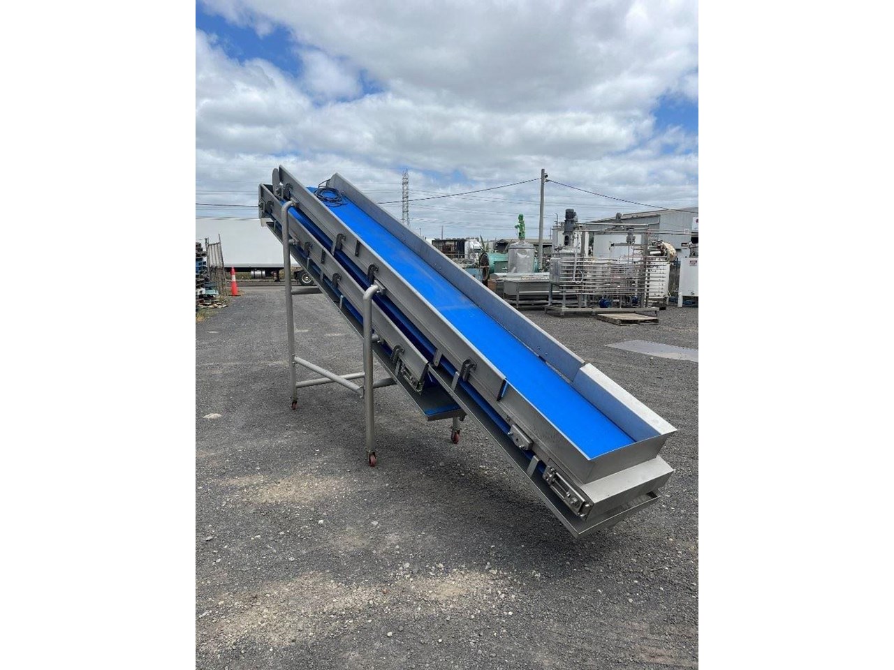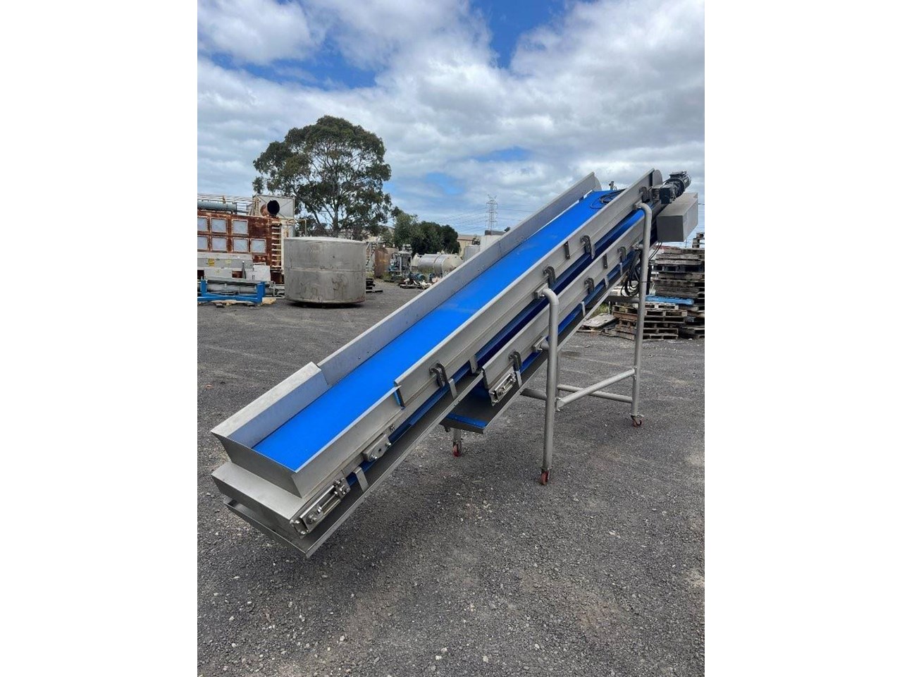 Unused stainless steel incline trough conveyors with food grade belt. 2 Conveyors currently mounted together. Conveyors can be purchased together or seperately. Top conveyor will be removed from bottom and new legs will be fabricated. Top conveyor specifications: 4.5 Metres long 580mm wide 3 Phase, 415V, 1.69A, 0.75kW, 50Hz Seimens gearmotor 1440/91.6RPM Belt speed 35M/min Food grade belt Stainless steel sidewalls Stainless steel drip tray underneath Conveyor can be used in an incline or flat position if required. Bottom conveyor specifications: 3.8 Metres long 580mm wide Bottom of conveyor belt 850mm high Discharge height 2300mm 3 Phase, 415V, 3.5A, 1.5kW, 50Hz Seimens gearmotor 1440/46.9RPM VSD Compatible with 30W cooling fan Belt speed 17.8M/min Food grade belt Stainless steel sidewalls Mounted to a ss frame with caster wheels for manouveribilty