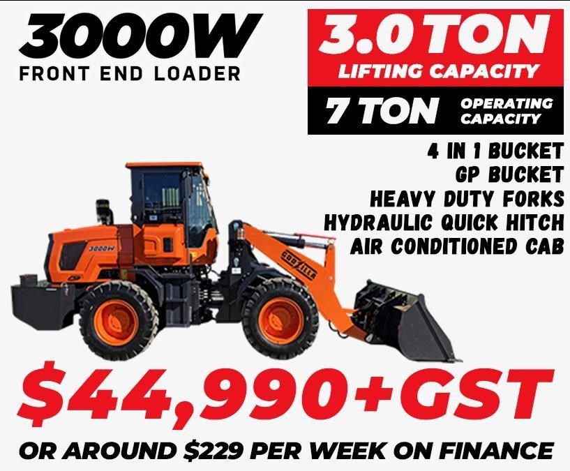 3000W Godzilla Loader - 7 Ton Operating Weight, 3 Ton Lifting Capacity, 132 HP Engine From just $44,990+GST or around $229 per week on finance, you can get started with the Massive 3000W today 3000W Mulcher Package Upgrade $24,990+GST or around $129 per week finance 3000W Slasher Package Upgrade $5,990+GST or around $29 per week finance 3000W Tree Feller Package Upgrade $14,990+GST or around $79 per week finance Do you have a property you need to take care of? Or need to pick up items up to 3 ton with a set of forks? Maybe you have a farm or need to do extra work at the weekends around your property or your business? The 3000w is a proven and reliable choice for your farm or business. Easy to maintain, 3 ton lifting capacity and huge 132 hp. At just $44,990+GST or around $229 per week on finance, it's a cost effective solution for working on your property or farm. If you're interested in looking at the features of the 3000W, watch the detailed video tour of the machine below. Massive 3000W 7 ton loader, with 4 cylinder 132 hp engine. Operating Weight - 7000kg / 7 ton Load Capacity - 3000 kg / 3 ton Engine - 4 cylinder, 132 HP Dimensions - 6715 (L) x 2230 (W) x 2950mm (H) (+130mm alarm lamp) Includes - GP bucket with 1.0m3 capacity, 4 in 1 bucket, heavy duty forks, hydraulic quick release hitch Warranty - 24 months manufacturer's warranty Delivery - Australia wide delivery available Easy to apply, no deposit and financing available- The Godzilla Loaders 3000W from just $229 per week, all done via experienced finance teams that search for the best deal for you. From the first day you own your new loader, no dodgy overpriced rent-to-own options Bucket and Arm Safety Lock - keep safe whilst you're working with our additional safety features Parking Brake - another safety feature that comes as standard with all Godzilla Loader models Lighting Package - includes warning light, front and rear turning light, rear width light Reverse Buzzer - alerts other workers and allows them to move out of the way whilst you're reversing Key Stop Engine - for the security of your machine when left on site Large Alloy Radiator with Cooling Fan - efficient cooling of engine and hydraulic oil Hydraulic Oil Cooler - this means it keeps oil temp lower allowing you to operate longer with no issues Auxiliary Hydraulic Outputs - this means you can add many options of external accessories to your Godzilla Loaders 3000W loader Hose Coupler Fittings - this means it eliminates the chance of dirt and other foreign objects getting into your Godzilla Loaders 3000W loader Quick Release Attachment Mounting Plate - you can buy attachments anywhere you like for your Godzilla Loaders 3000W loader or use ones you may have already Gauges and Warning Lights - these gauges point out if there are any issues, meaning you can stop the machine and rectify before any damage is caused allowing your Godzilla Loaders 3000W loader machine a long and reliable service life. Service Kit and Tools - included free is a tool box and service kit so you wont have to go digging for tools if you need to service or adjust something on your Godzilla Loaders 3000W loader Engine Access Panel Hinged - this gives you easy access to all your components of your Godzilla Loaders 3000W loader Tie Down Locations - safe security for transporting for your Godzilla Loaders 3000W loader Emergency Stop Switch - quick and easy to hit in case of any issues while operating the machine; all standard on the Godzilla Loaders 3000W loader Lift Hook Locations - if you have to lift your machine on to a site via a crane etc it can be done easily without any risk to your Godzilla Loaders 3000W loader Lift Arm Safety Support - this means you are safe when using your Godzilla Loaders 3000W loader Upgrade to the Premium Package - Everything in the Standard Package plus Premium Cummins Engine $7,990 + GST or around $39 per week on finance Delivery at cost or you can pick up. We organise custom pricing including the attachments you require in your package, then raise your invoice so everything is clear for you. Once you are happy with everything, you either pay your deposit to go into production, with your balance due once production is complete and your loader is ready for delivery, or if you are applying for finance, you will deal with the finance broker directly to get your loan approved. Heavy duty, economical and reliable. The 3000W could be exactly what you're looking for.