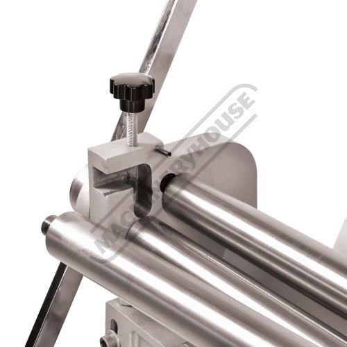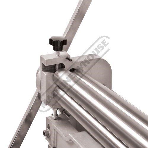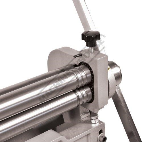 A compact three-function sheet metal working machine which will shear, roll and bend thin sheet material up to a maximum width of 1000mm. The handle operates all three functions at the same time, but only one function can be used at one time - the rolls incorporates wiring grooves and are rotated directly whilst the bending and shearing functions operate via an eccentric cam. The pressbrake bending dies can be removed in sections to allow for partial bends to be formed and the top roll can be removed completely when forming closed cylinders. The maximum thickness capacity of 1mm for mild steel & 1.5mm for soft grade aluminium, This compact machine is perfect on small jobs and low production runs for the home engineer's workshop.
