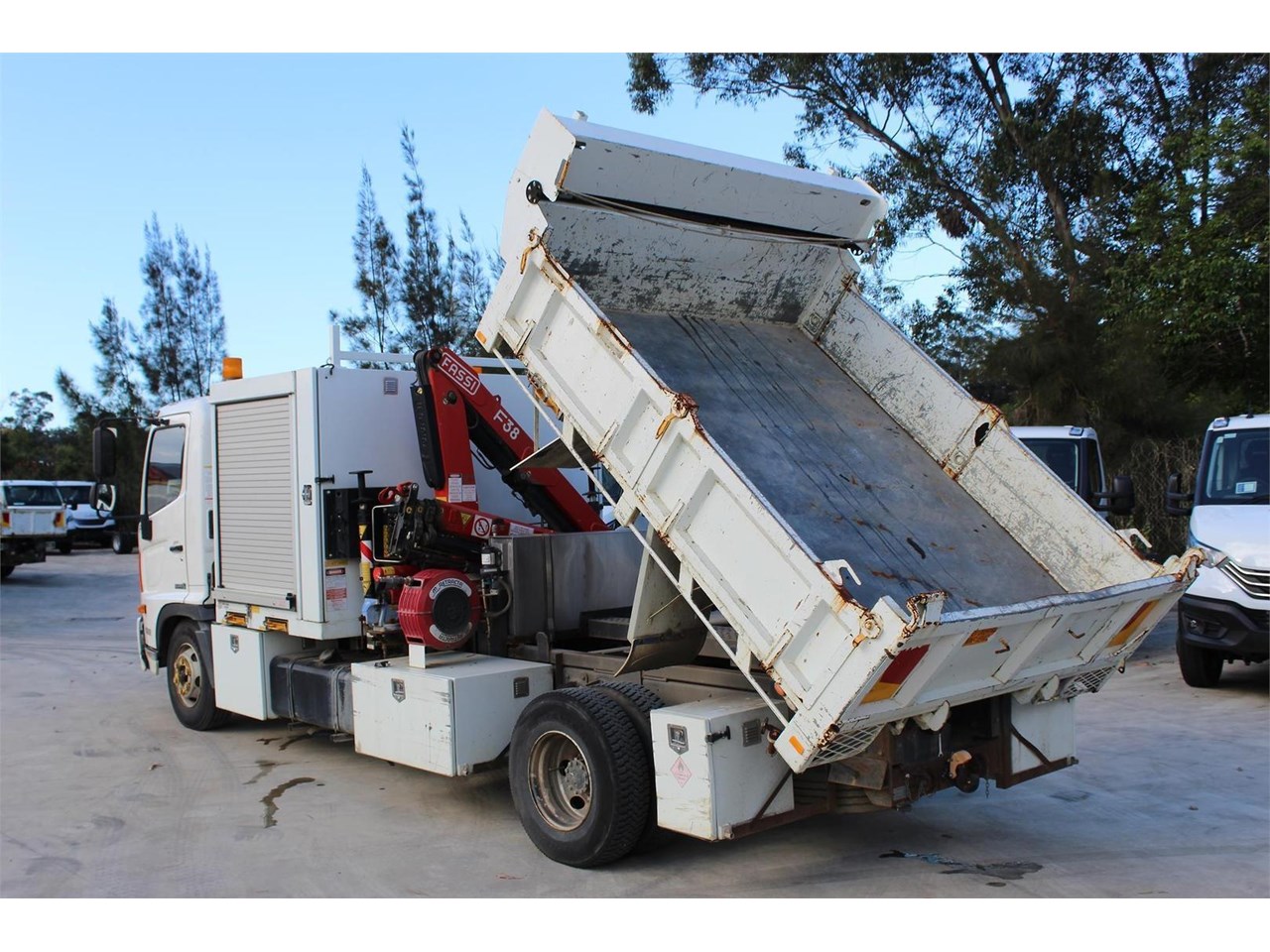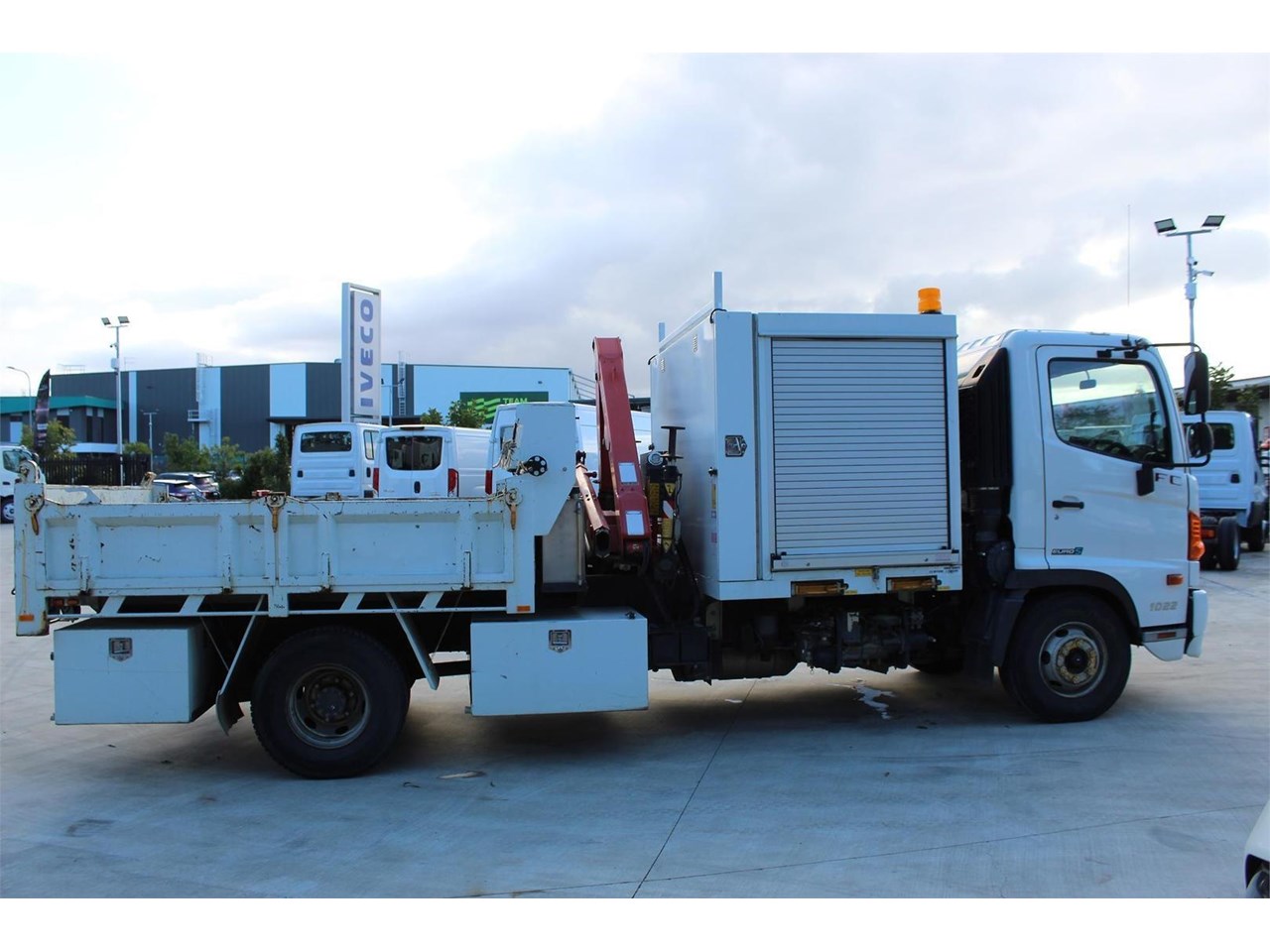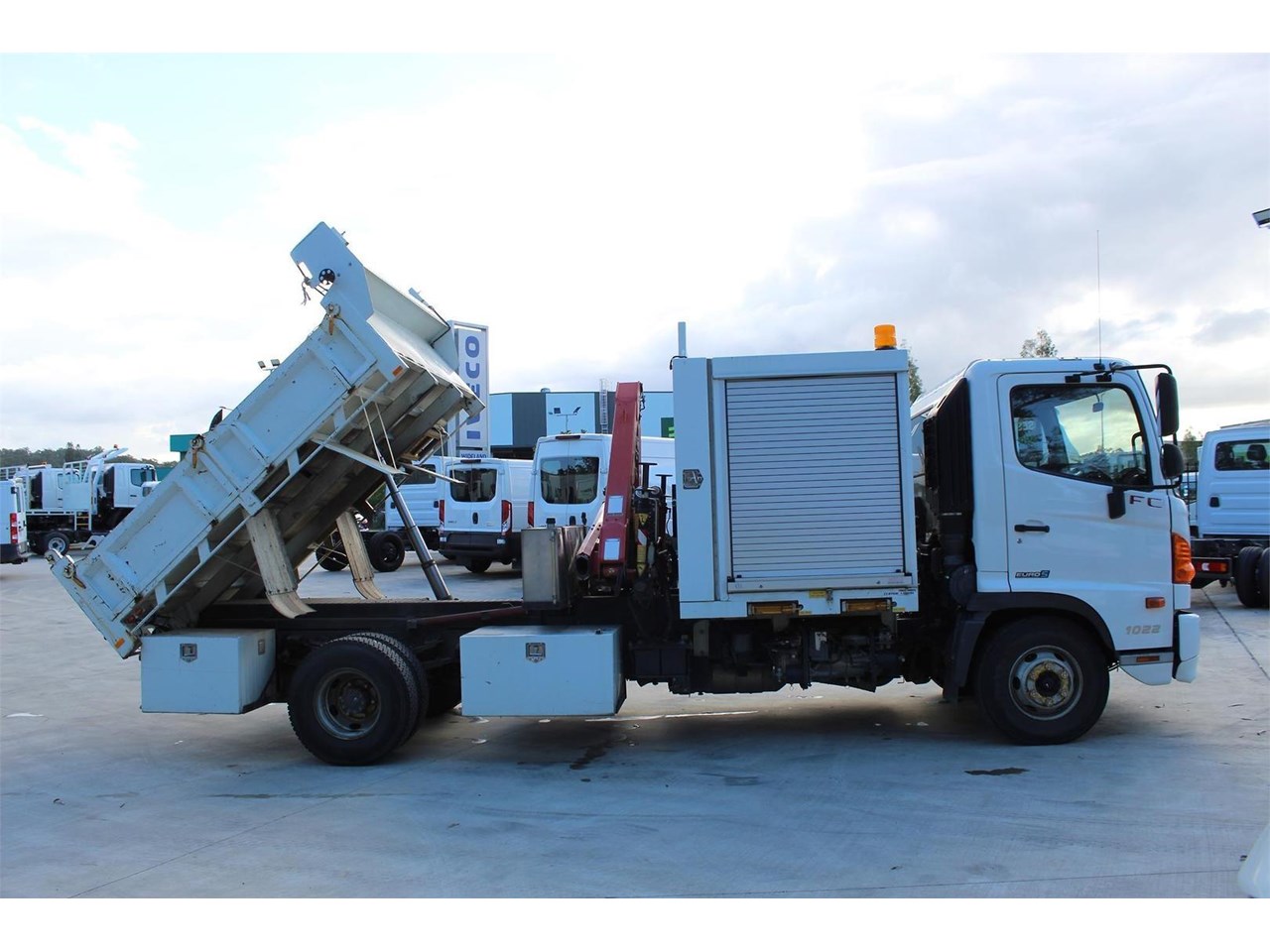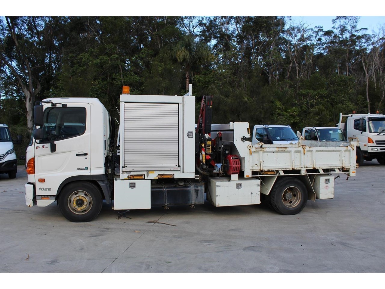 Ex-Council 2014 Hino FC1022 service tipper body with Crane