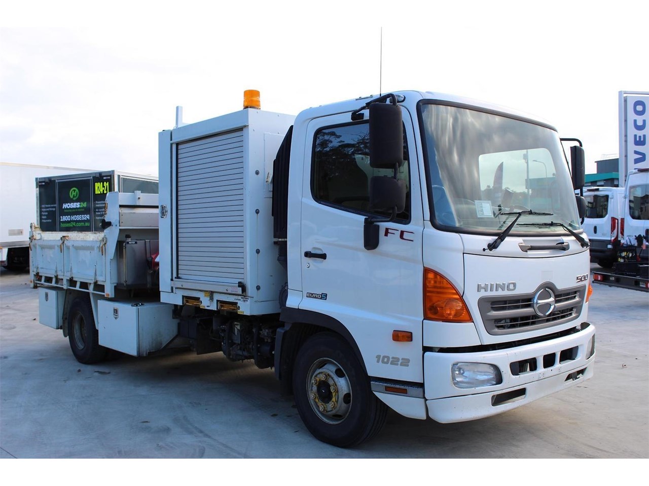 The Hino FC 1022 has a 6 speed Manual Transmission, Air-conditioning, reverse camera, suspension driver's seat, 7 large tool / storage boxes, tow bar, retractable tarp and more.