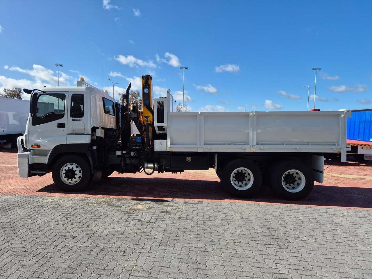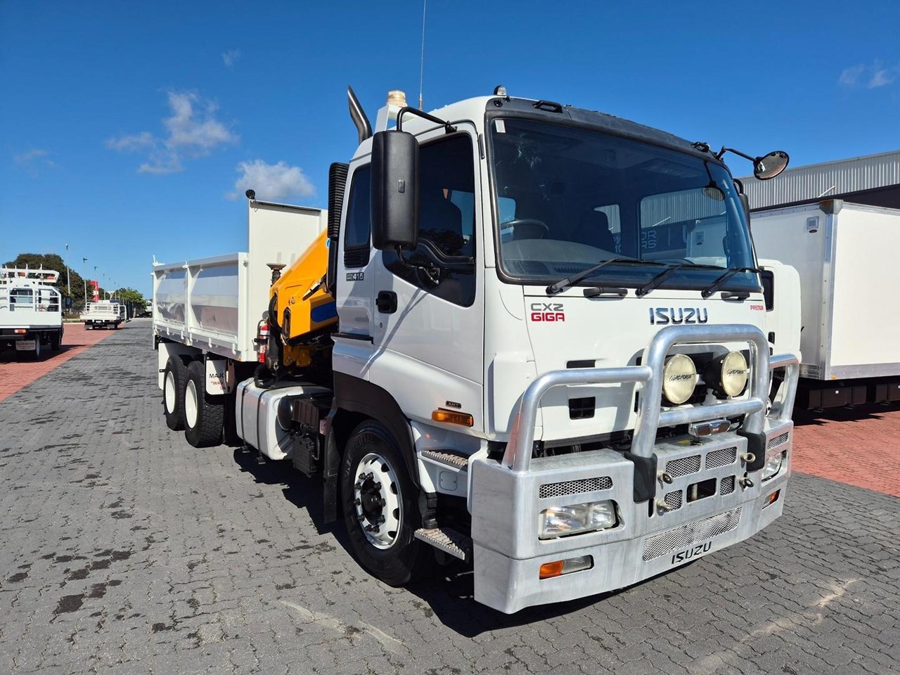 Ex Government Low Low Klm ISUZU GIGA CXZ415 AUTO Tipper and Crane Combo, 415HP Powerplant coupled to a 12 Speed Automated Transmission, fitted with 4.5m Drop Side Tipper Body with a Bartlett Ball Towbar, with Air to Rear, Reverse Camera. Bullbar, UHF Radio, Underbody Toll Boxes, Amber Beacons and complete with a Remote Controlled EFFER 100/4S Crane and will impress!