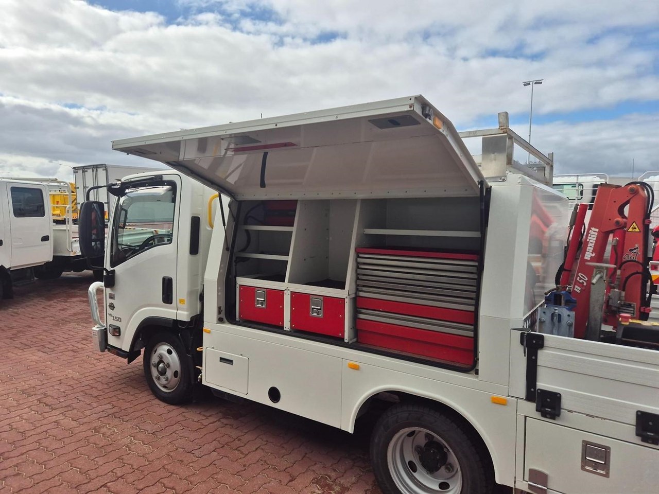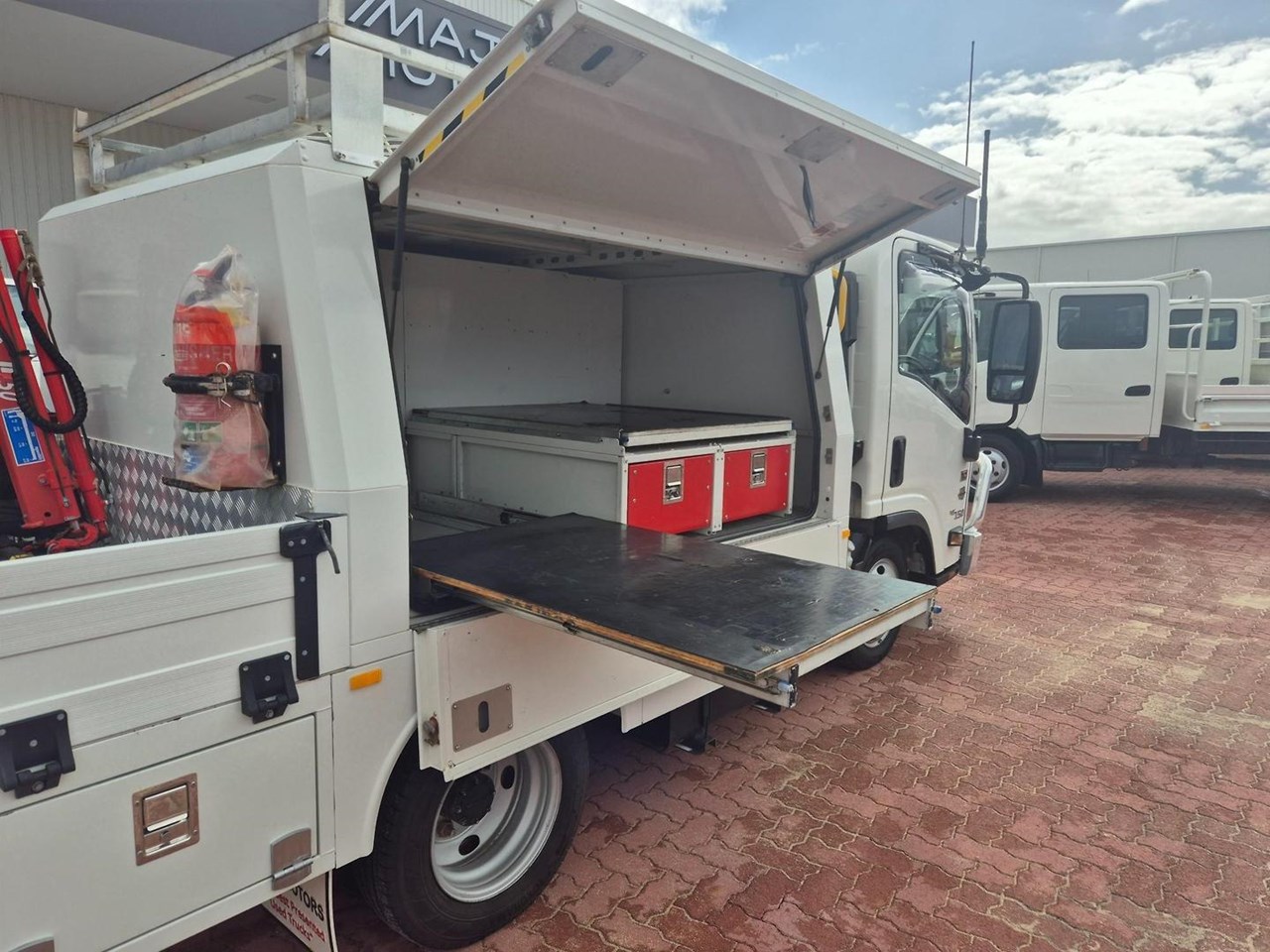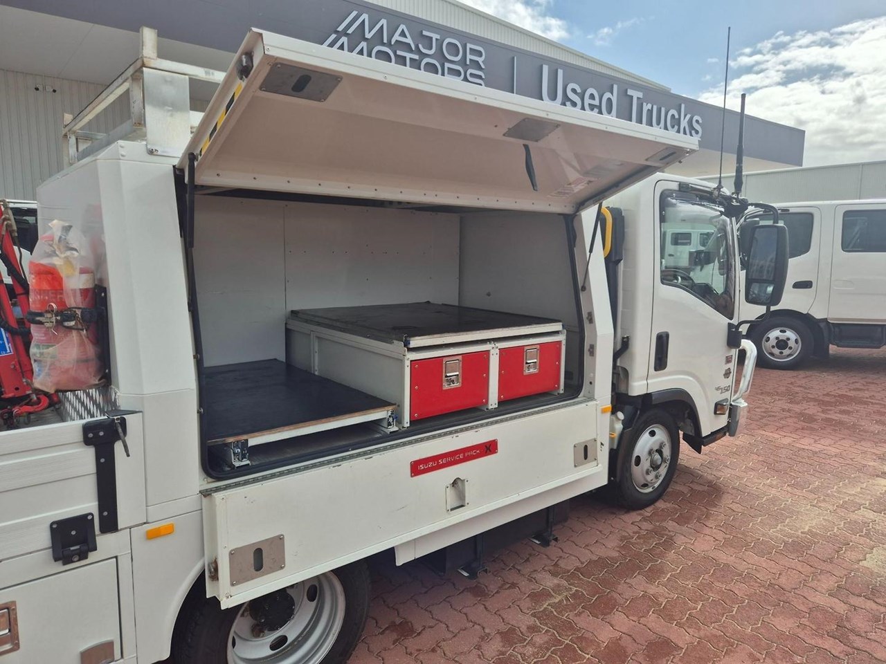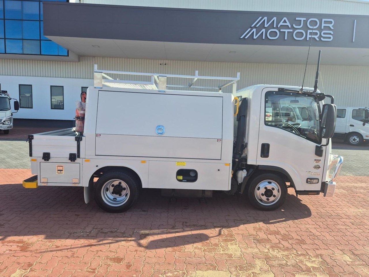 One of our MY21 2021 Model Isuzu NLR45-150 AMT "Service Body X". Features AMT (Automated Manual Transmission), towbar, under tray storage/toolboxes, reverse camera, and Service body with gull-wing doors on either side and fitted with a Full Custom Genuine Isuzu internal fit out, including a Redarc Inverter, Bullbar, Spotlights, UHF Radio, Fire Extinguisher, Vice and a Maxilift 50 Crane!