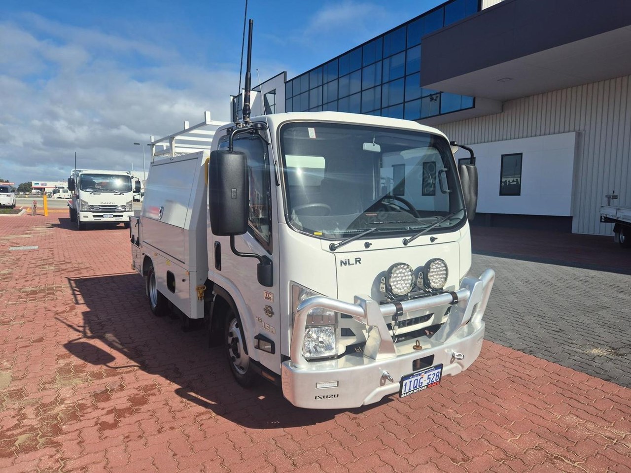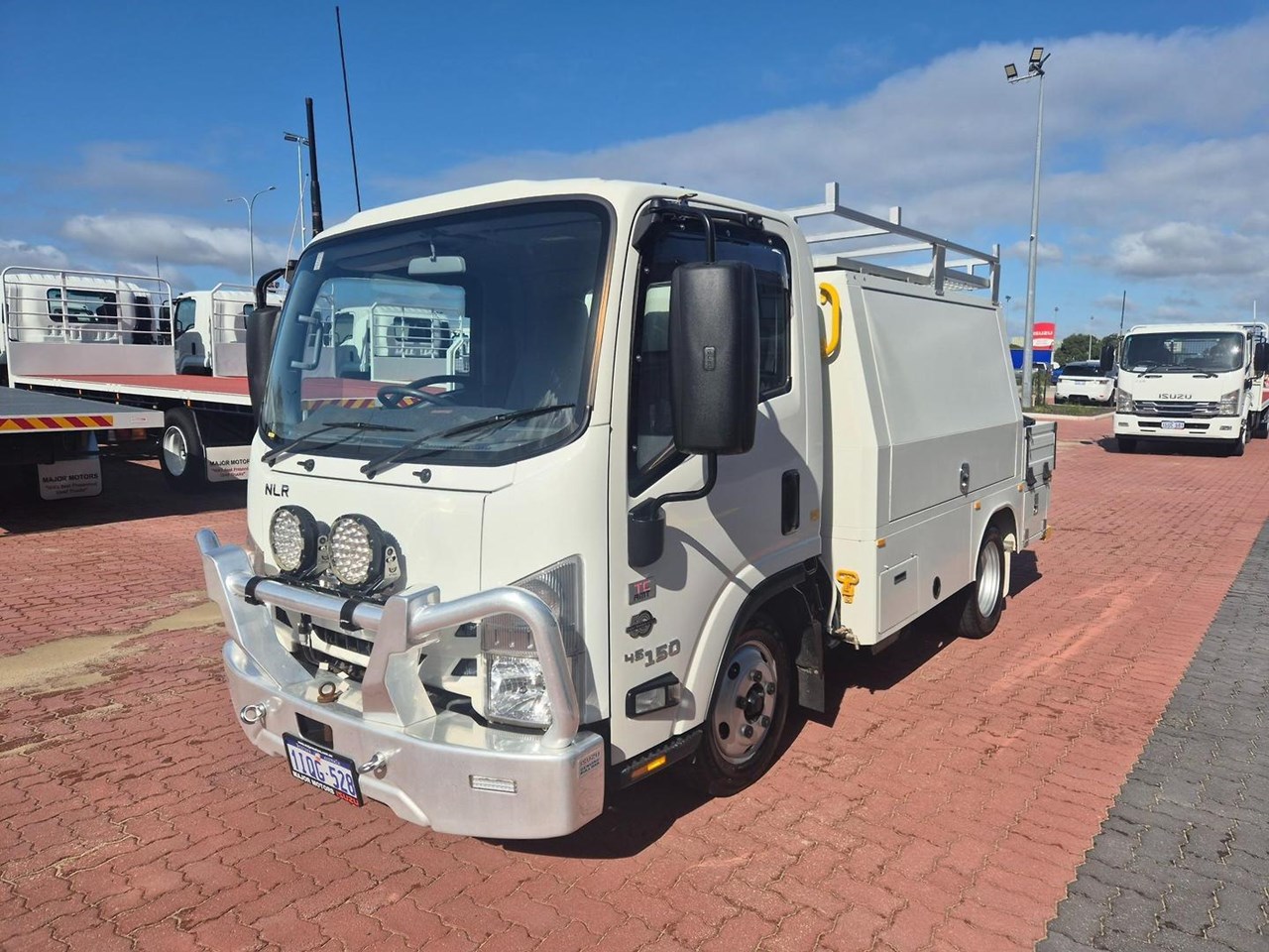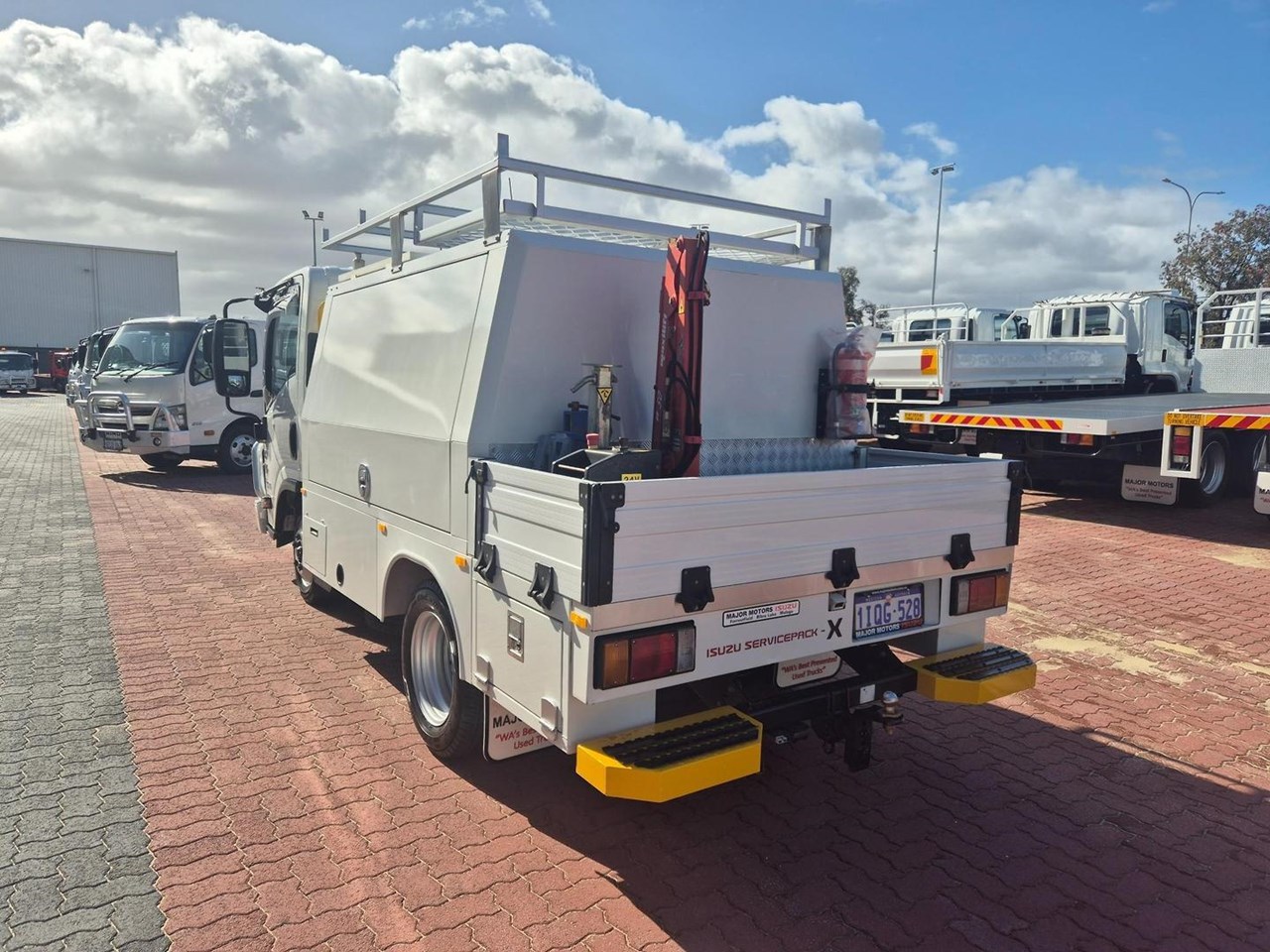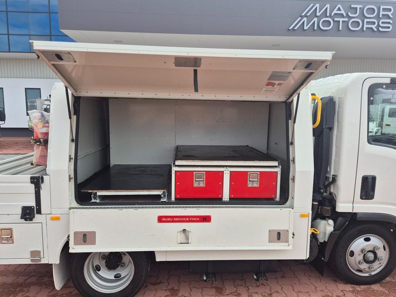 One of our MY21 2021 Model Isuzu NLR45-150 AMT "Service Body X". Features AMT (Automated Manual Transmission), towbar, under tray storage/toolboxes, reverse camera, and Service body with gull-wing doors on either side and fitted with a Full Custom Genuine Isuzu internal fit out, including a Redarc Inverter, Bullbar, Spotlights, UHF Radio, Fire Extinguisher, Vice and a Maxilift 50 Crane!