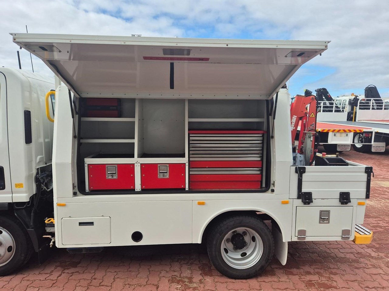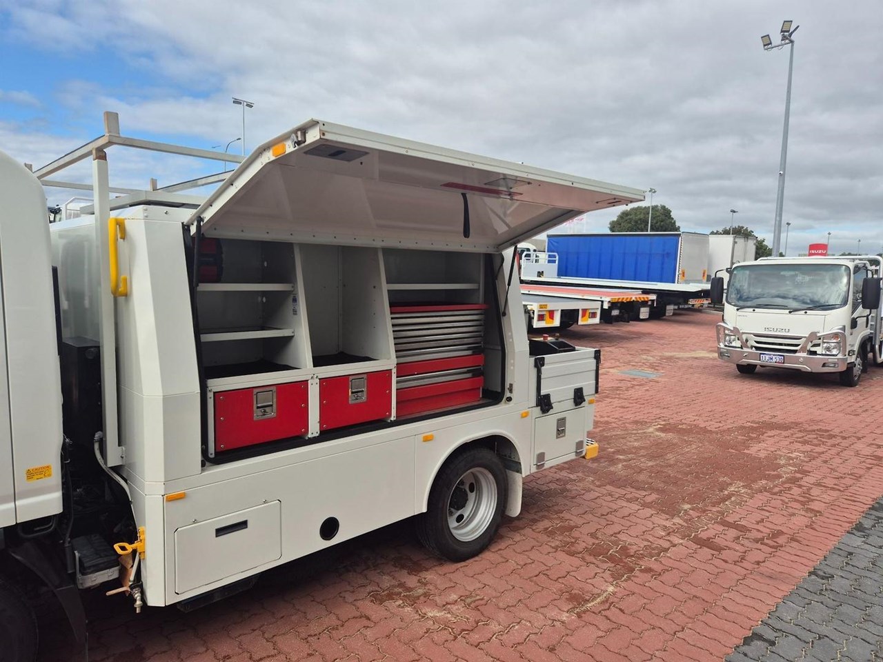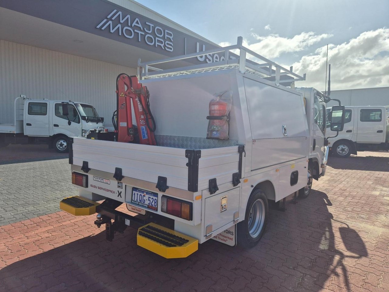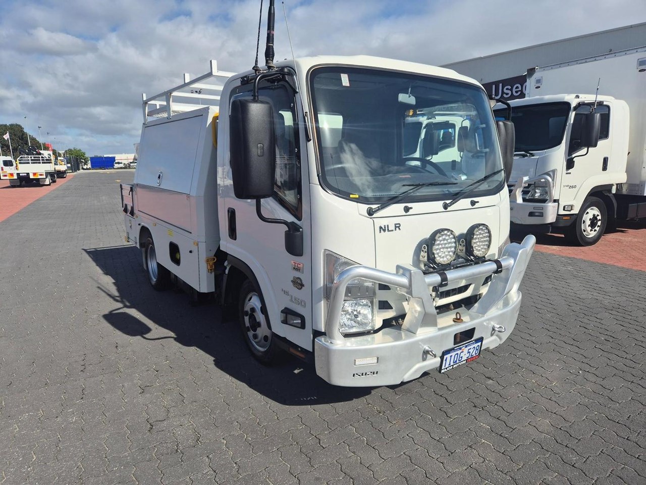 One of our MY21 2021 Model Isuzu NLR45-150 AMT "Service Body X". Features AMT (Automated Manual Transmission), towbar, under tray storage/toolboxes, reverse camera, and Service body with gull-wing doors on either side and fitted with a Full Custom Genuine Isuzu internal fit out, including a Redarc Inverter, Bullbar, Spotlights, UHF Radio, Fire Extinguisher, Vice and a Maxilift 50 Crane!
