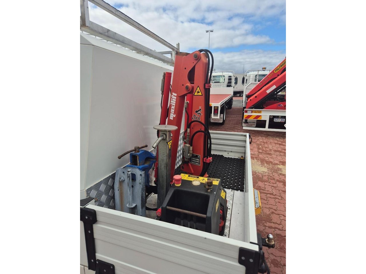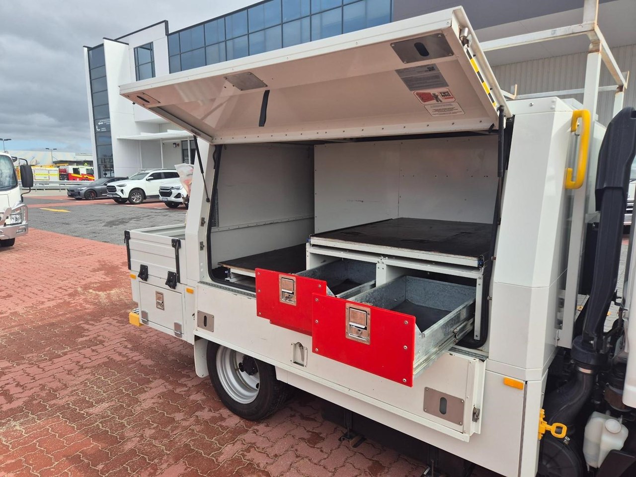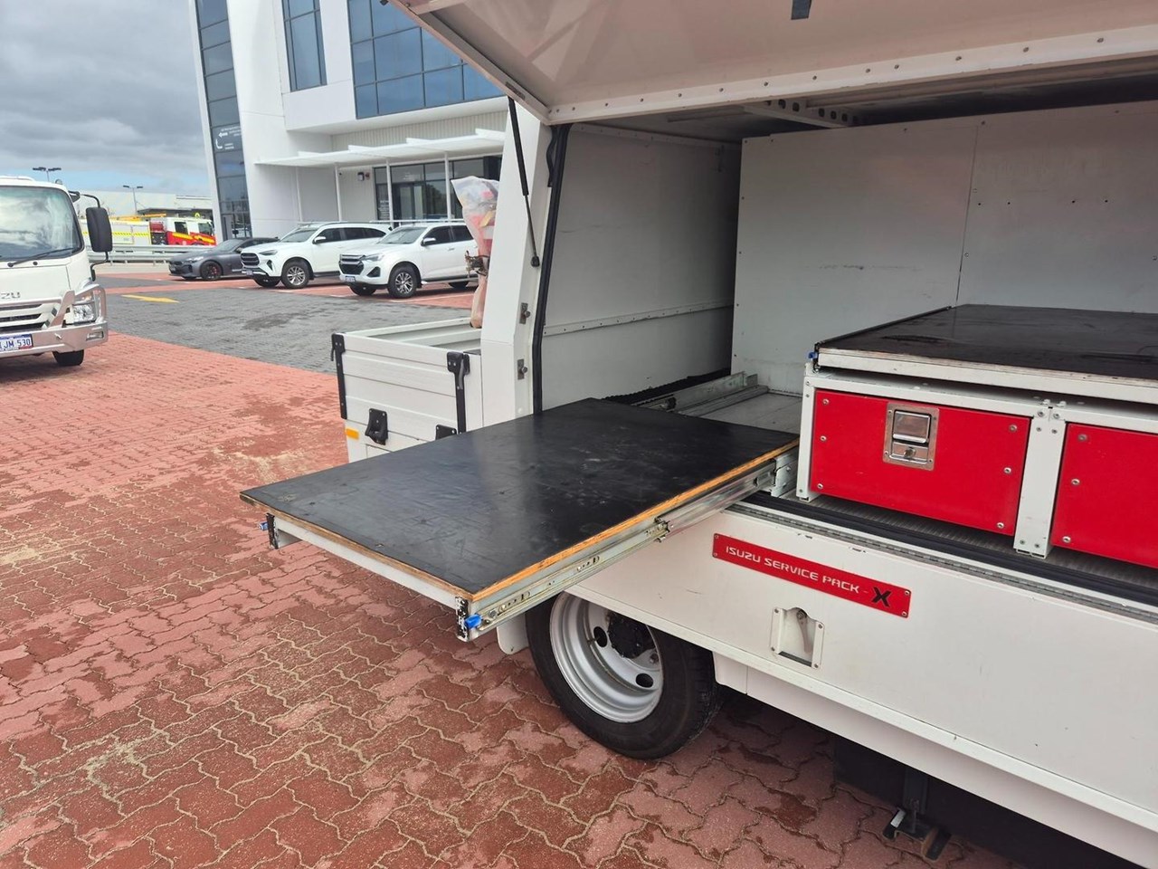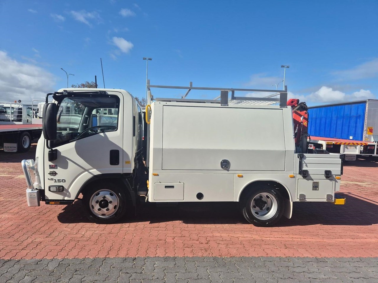 One of our MY21 2021 Model Isuzu NLR45-150 AMT "Service Body X". Features AMT (Automated Manual Transmission), towbar, under tray storage/toolboxes, reverse camera, and Service body with gull-wing doors on either side and fitted with a Full Custom Genuine Isuzu internal fit out, including a Redarc Inverter, Bullbar, Spotlights, UHF Radio, Fire Extinguisher, Vice and a Maxilift 50 Crane!