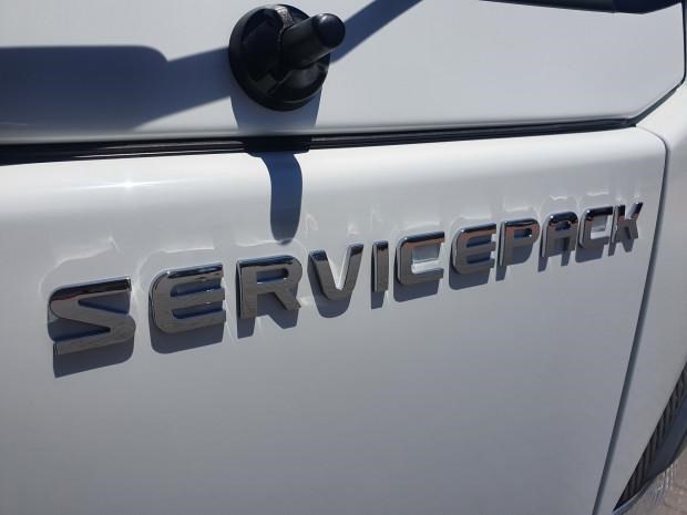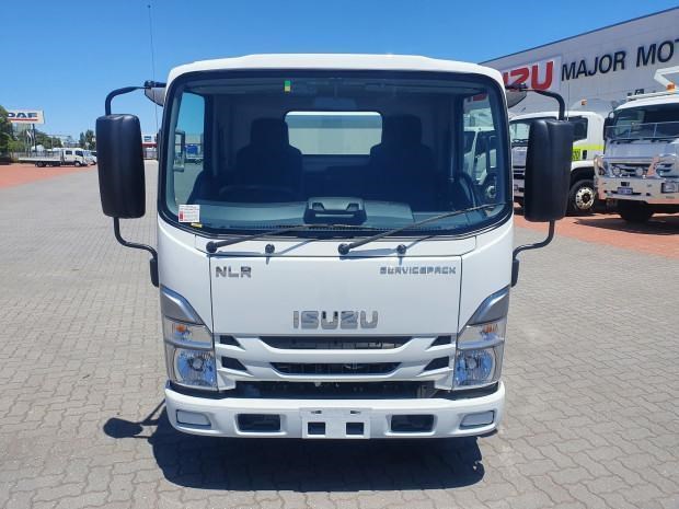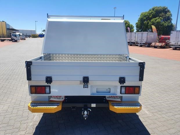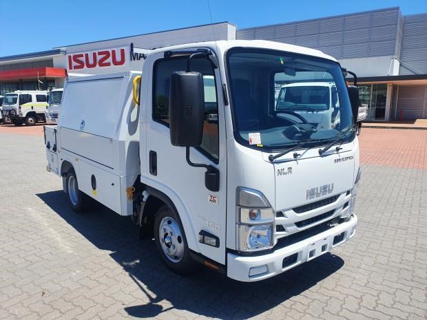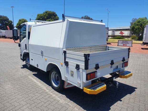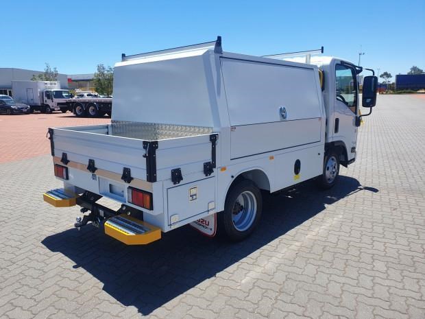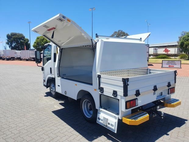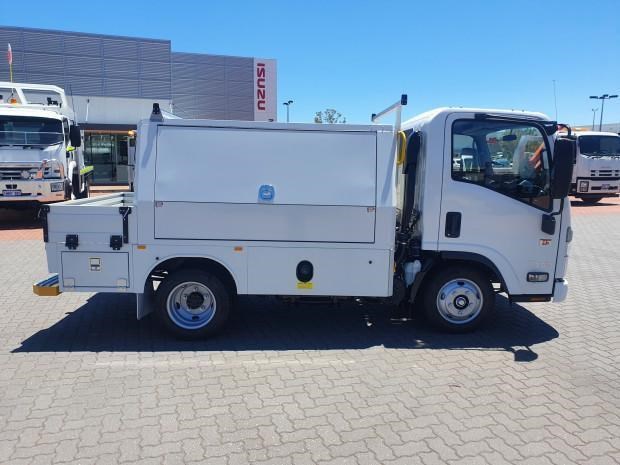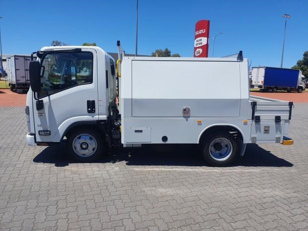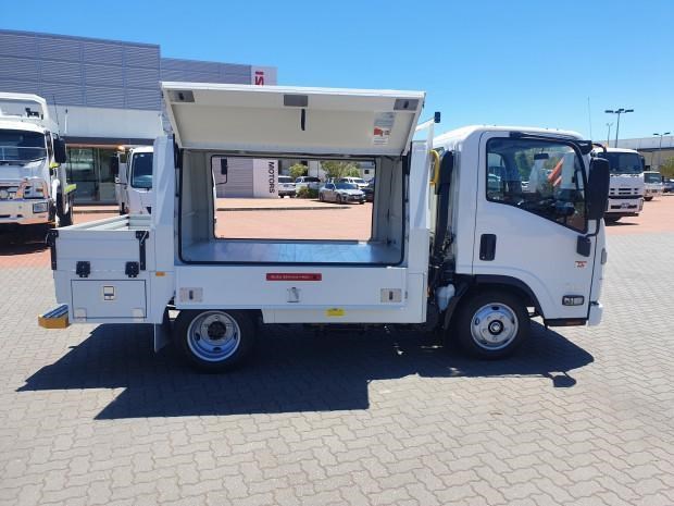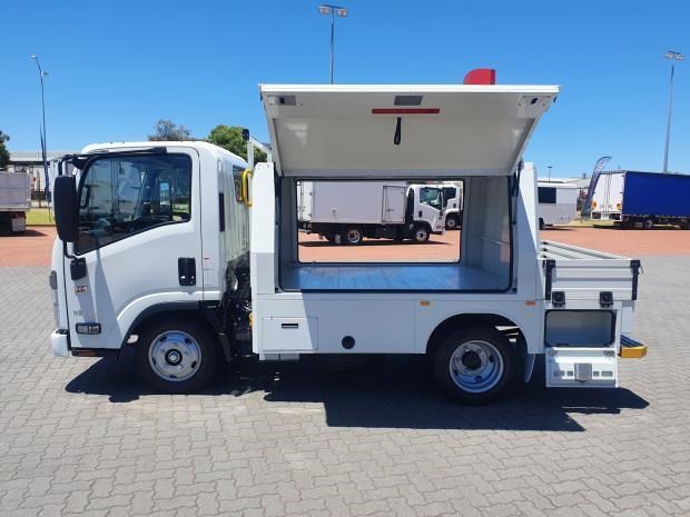Ex Isuzu Demo (MY21) 2022 Model Isuzu NLR45-150 AMT "Service Body X". Features AMT (Automated Manual Transmission), towbar, under tray storage/toolboxes, reverse camera, and Service body with gull-wing doors on either side.