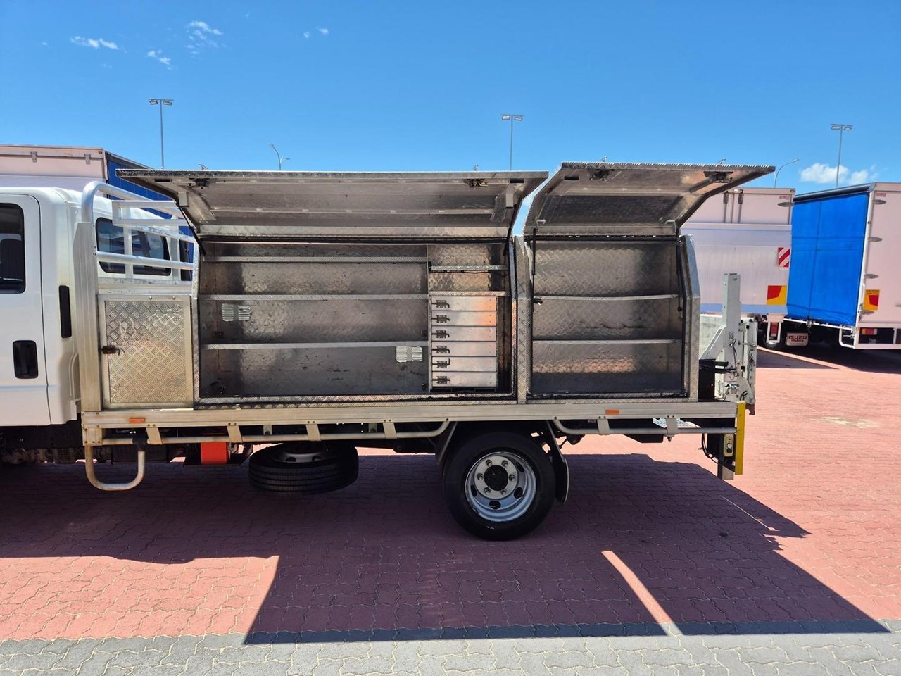 2019 Isuzu NPR75-190 AMT 4 ton Crew Cab with the Massive 190HP Powerplant coupled to a 6 Speed (Automated Manual Transmission) complete with a 4.1m Heavy Alloy Tray with Full Toolboxes down both sides and a 500kg Tommy Gate Lift at the Rear.