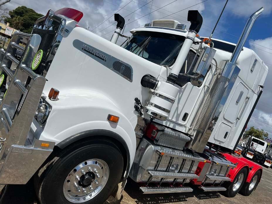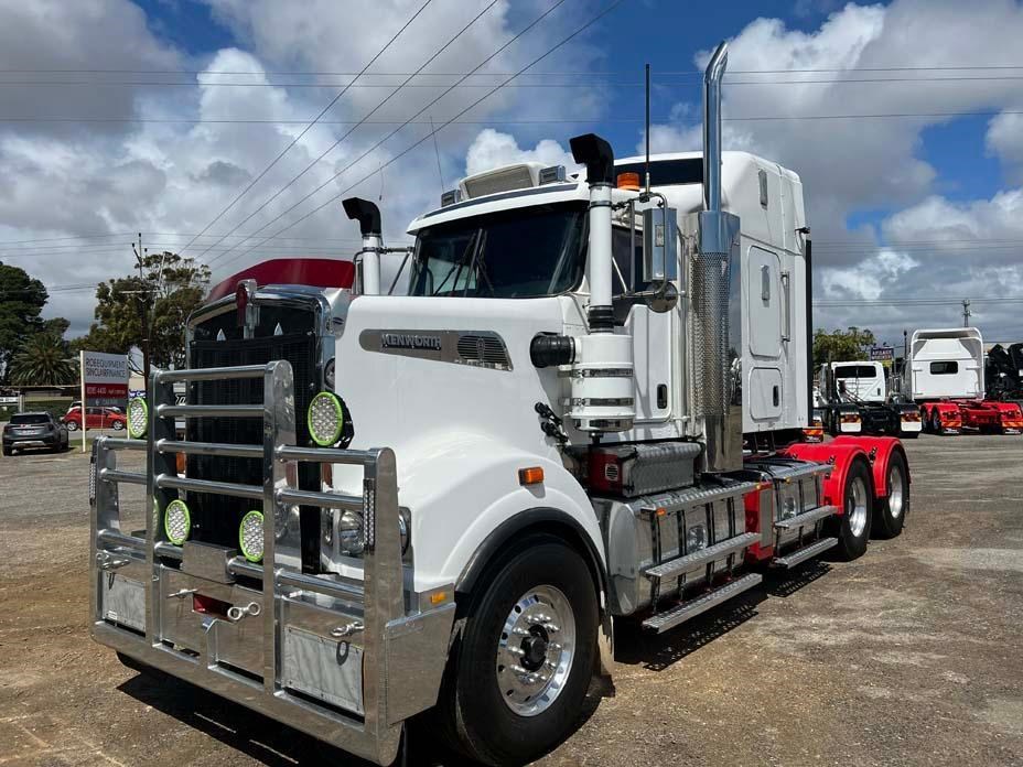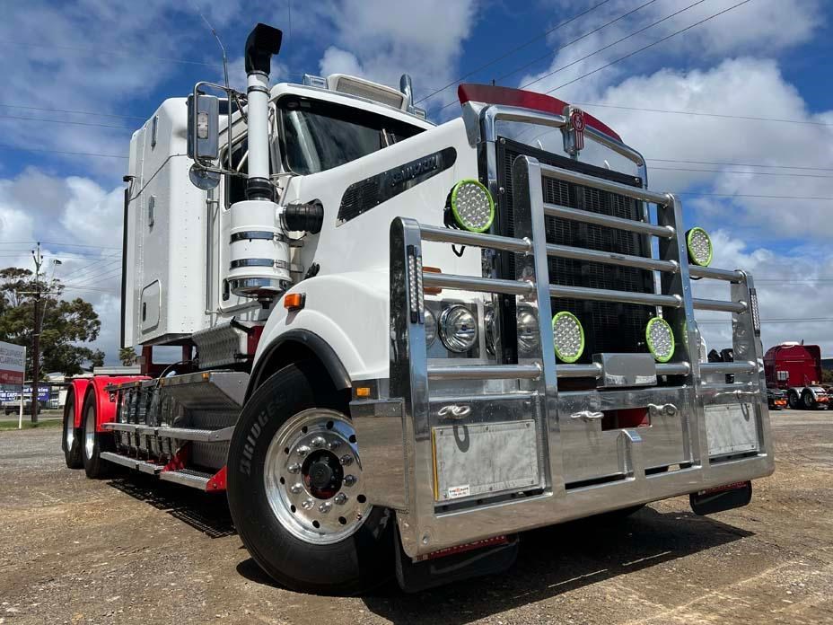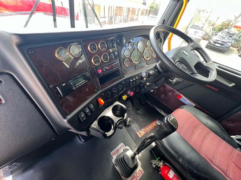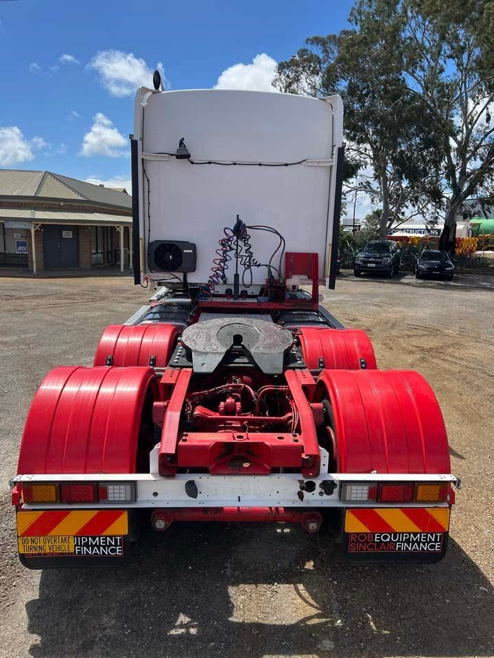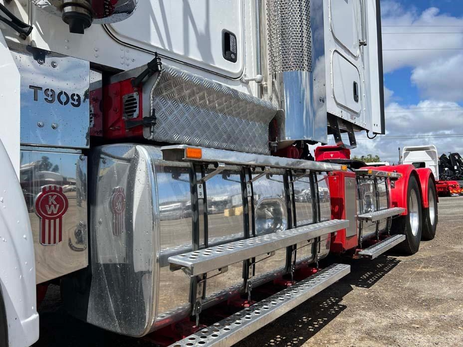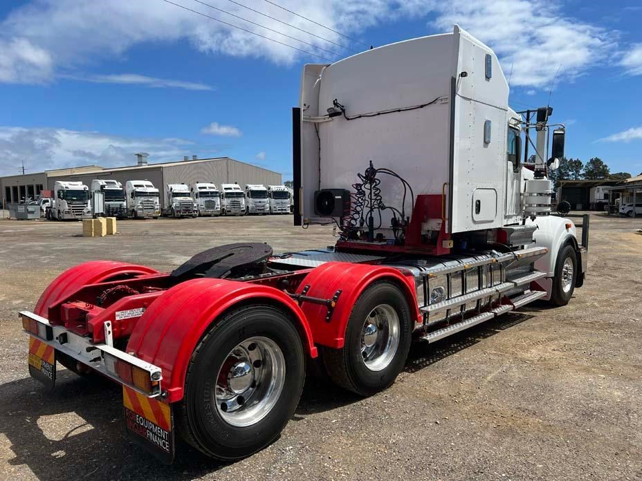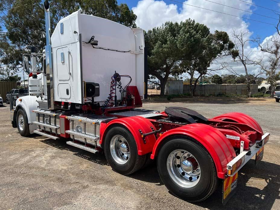10/2017 Kenworth T909 6x4 prime mover,550 hp Cummins X15 Eng-Has Cummins engine history-18 spd trans-RTL020918B-Dana D52-190 rear axles @ 4.56 on Neway AD246/10 Air bag susp,Alloy wheels and FUPS bull bar,Super singles on steer,50" high roof intergreated sleeper with Ecowind bunk air con,,Roof mounted air con condensor,Diff and rear axle x lock,2" fixed QRTT,Water tank,Alloy walkplate,2 x rotating beacons,Dolly pull in rear with air and electric fittings,2700 watt inverter,5910mm truck has just passed SA Roadworthy and is in very good condition with recent engine history.155 ton Road Train rated.