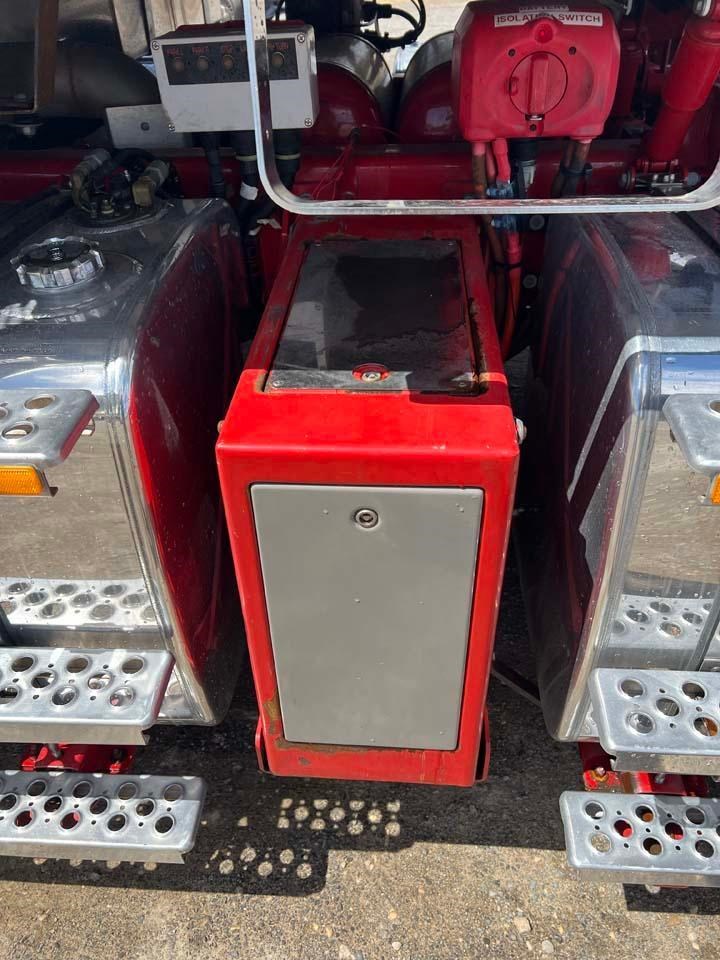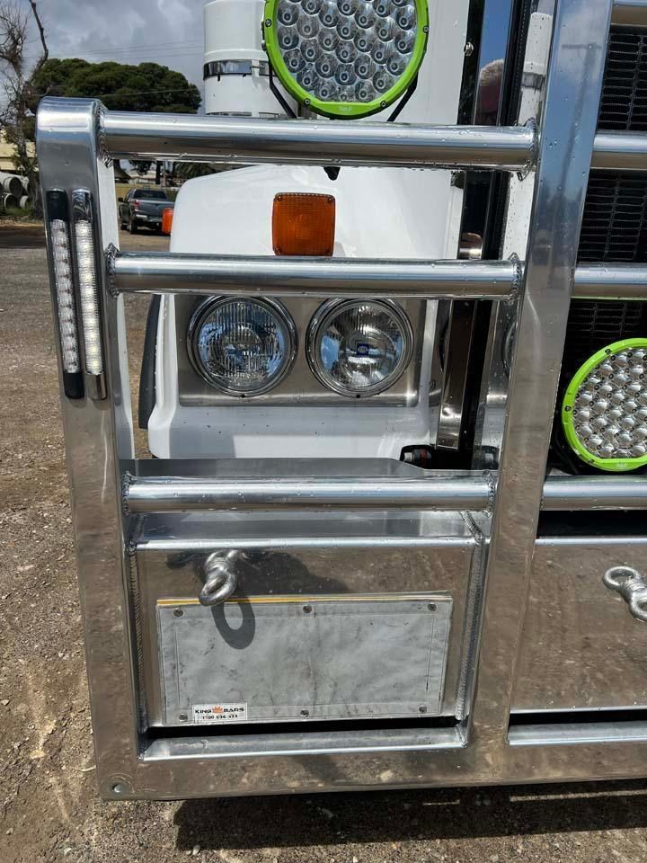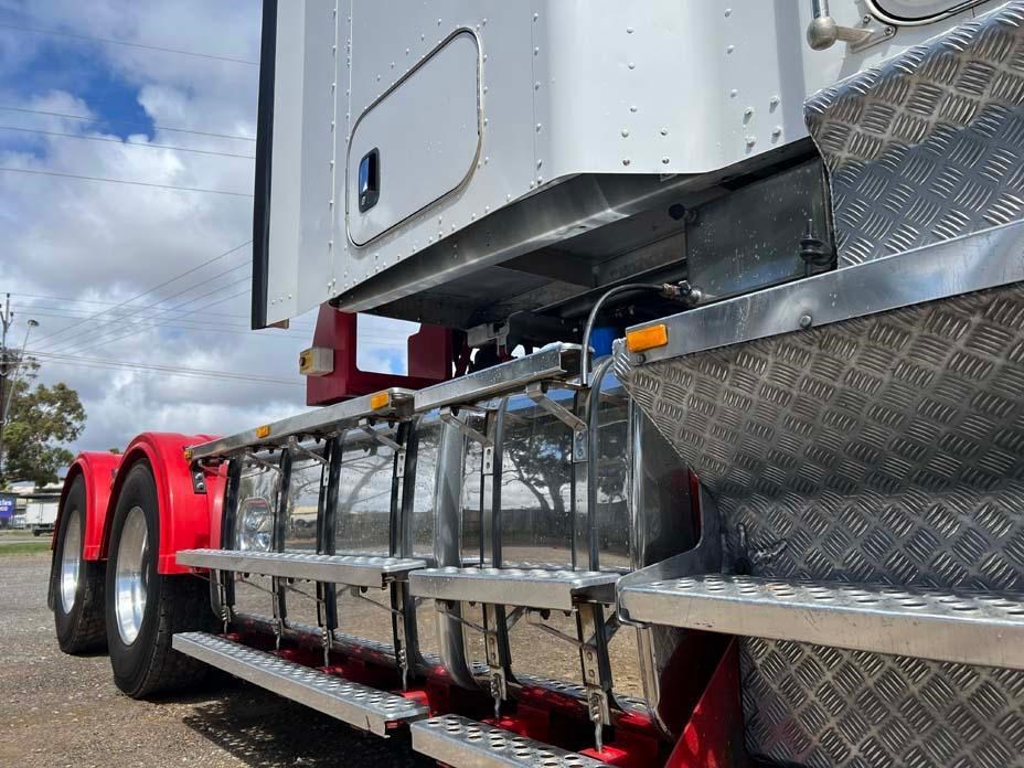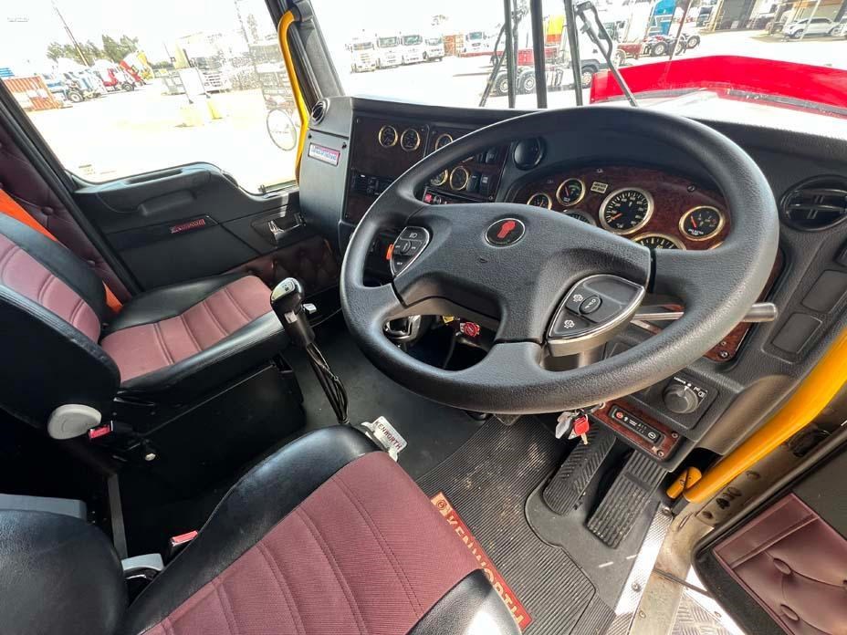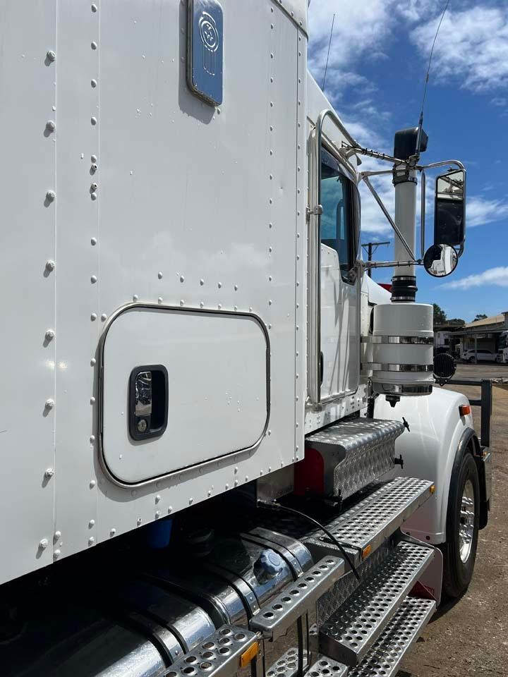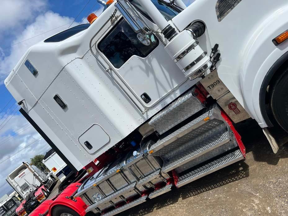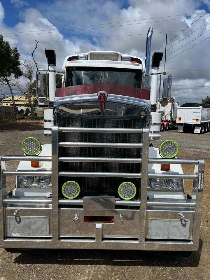 10/2017 Kenworth T909 6x4 prime mover,550 hp Cummins X15 Eng-Has Cummins engine history-18 spd trans-RTL020918B-Dana D52-190 rear axles @ 4.56 on Neway AD246/10 Air bag susp,Alloy wheels and FUPS bull bar,Super singles on steer,50" high roof intergreated sleeper with Ecowind bunk air con,,Roof mounted air con condensor,Diff and rear axle x lock,2" fixed QRTT,Water tank,Alloy walkplate,2 x rotating beacons,Dolly pull in rear with air and electric fittings,2700 watt inverter,5910mm truck has just passed SA Roadworthy and is in very good condition with recent engine history.155 ton Road Train rated.