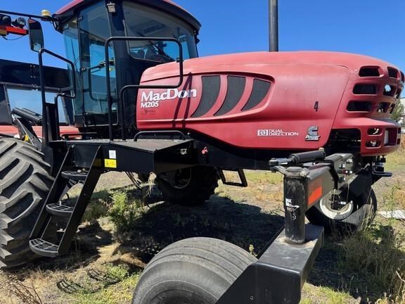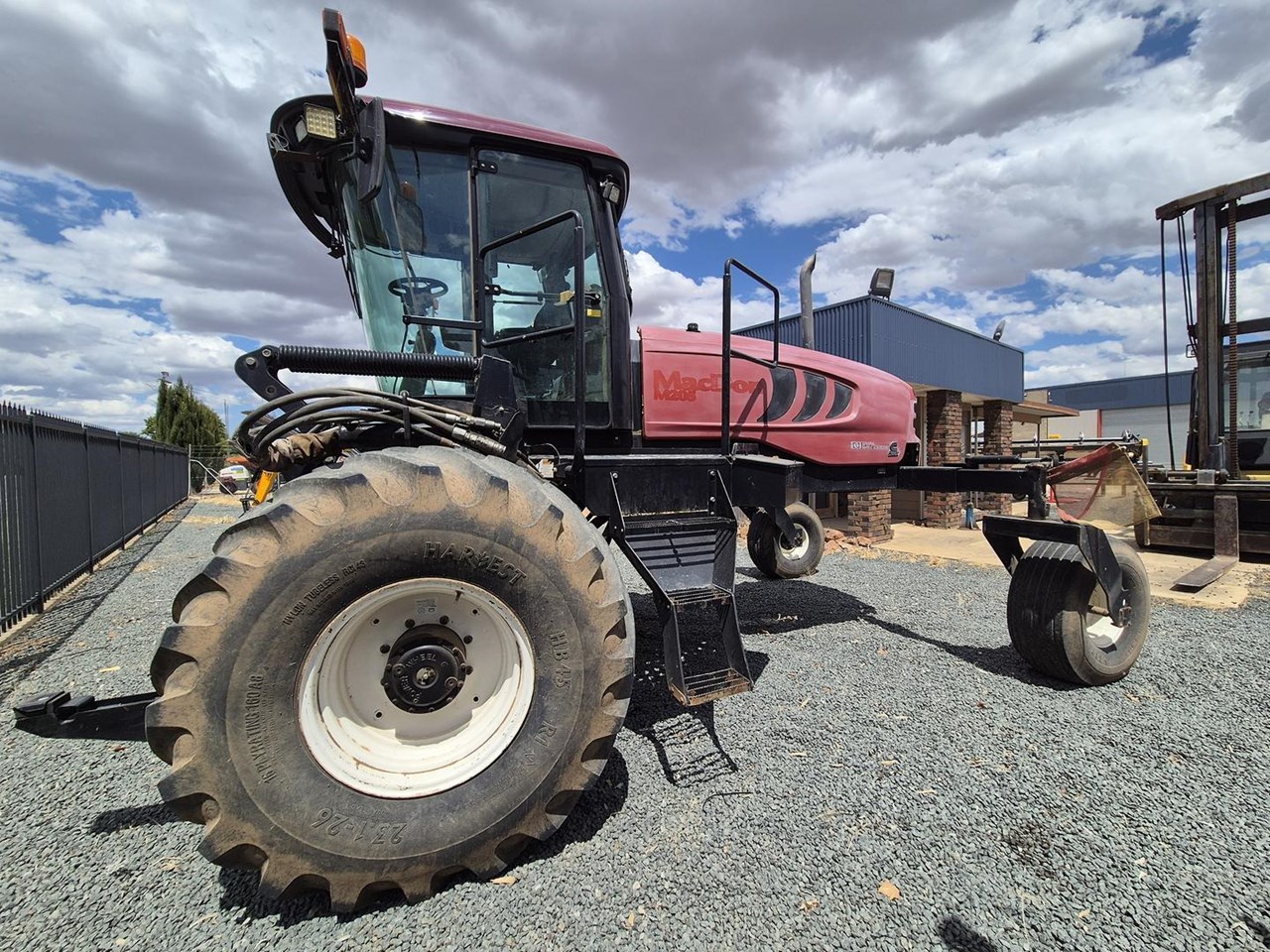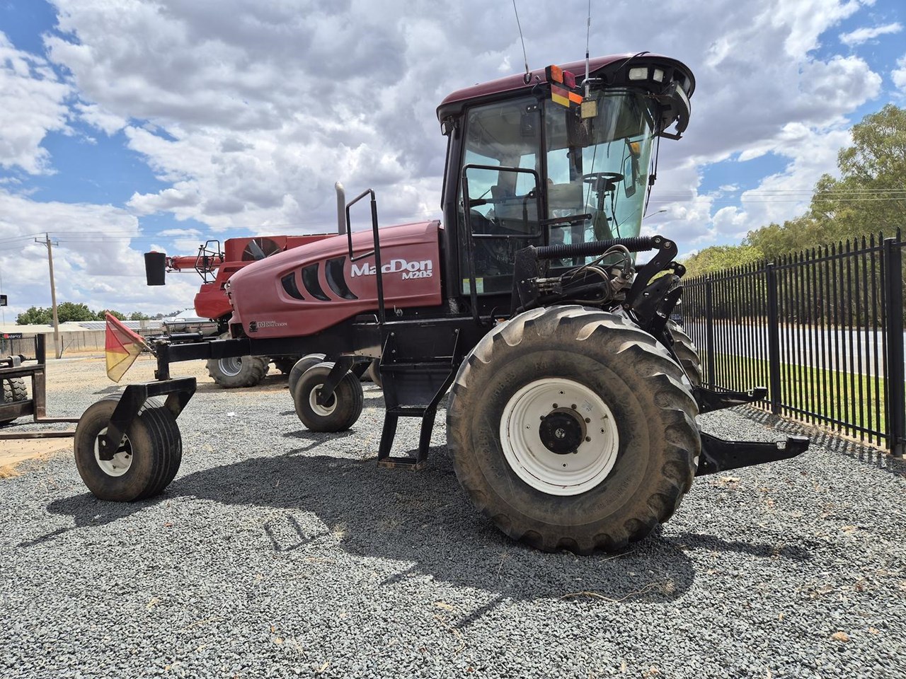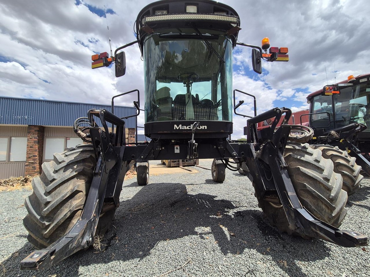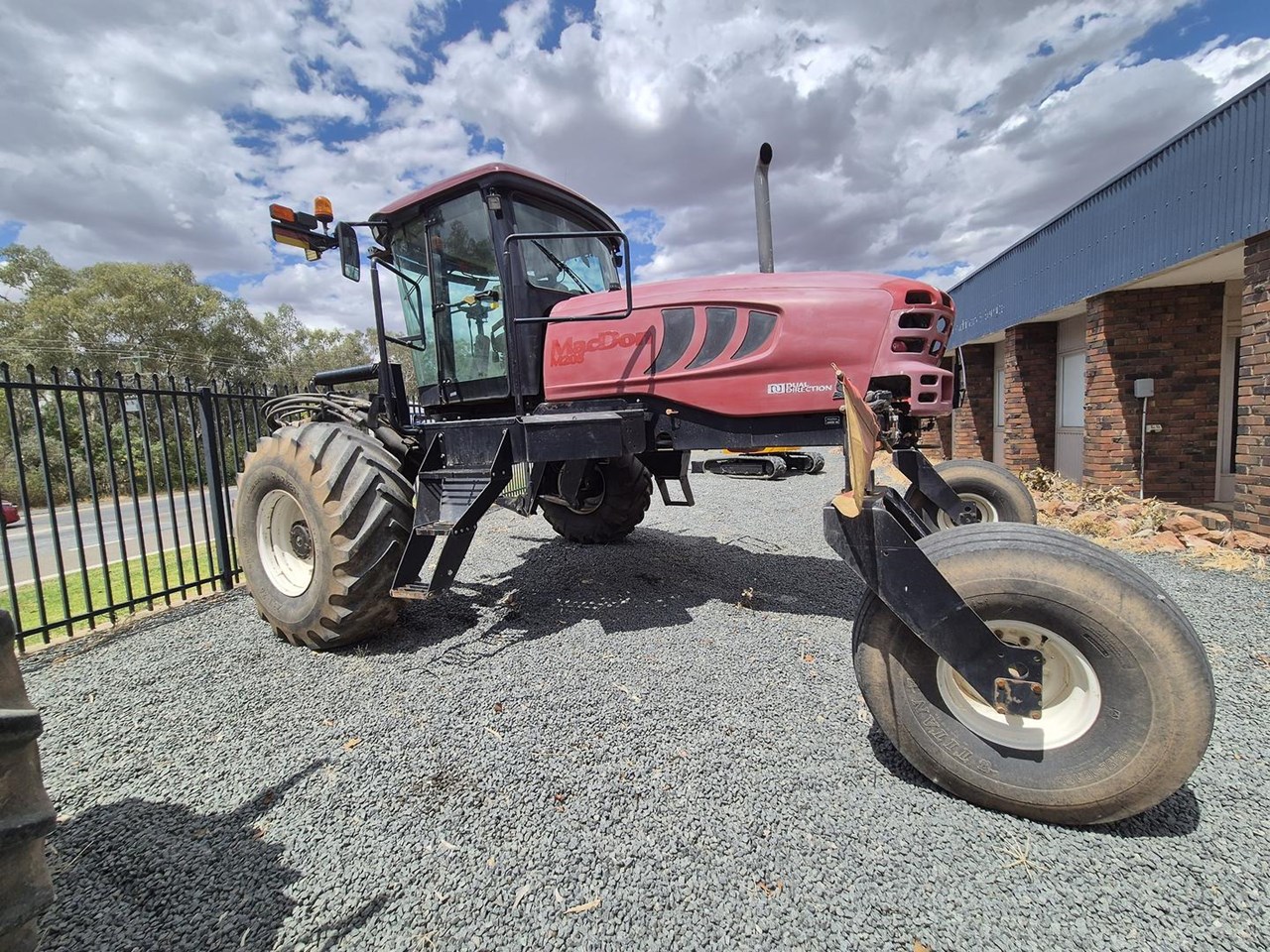 2011 MacDon M205 windrower, S/N 209936-11, approx. 2,900 hours. Fitted with FM750 EZ-Steer and Ag25 receiver, LED lightbar and LED work lights. Runs on 600/65R28 traction tyres with 16.5-16.15L caster wheels. Located Wagga.5L Casters, Wagga.