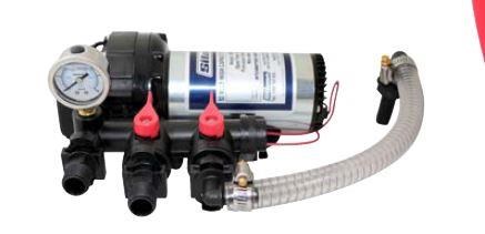 - Aquatec (DDP-555) 12-volt DC electric, electric pressure sensing switch. 11 Amps max draw. 14L/Min open flow, 4 Bar/60psi maximum pressure. Chemical resistant Viton valves and Santo diaphragm - On/Off switch and 3m of battery cable with alligator clips.