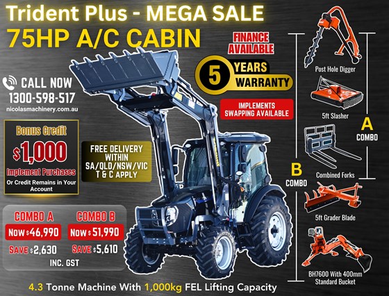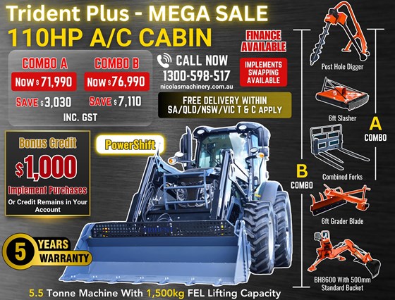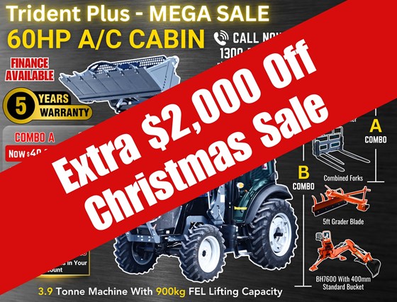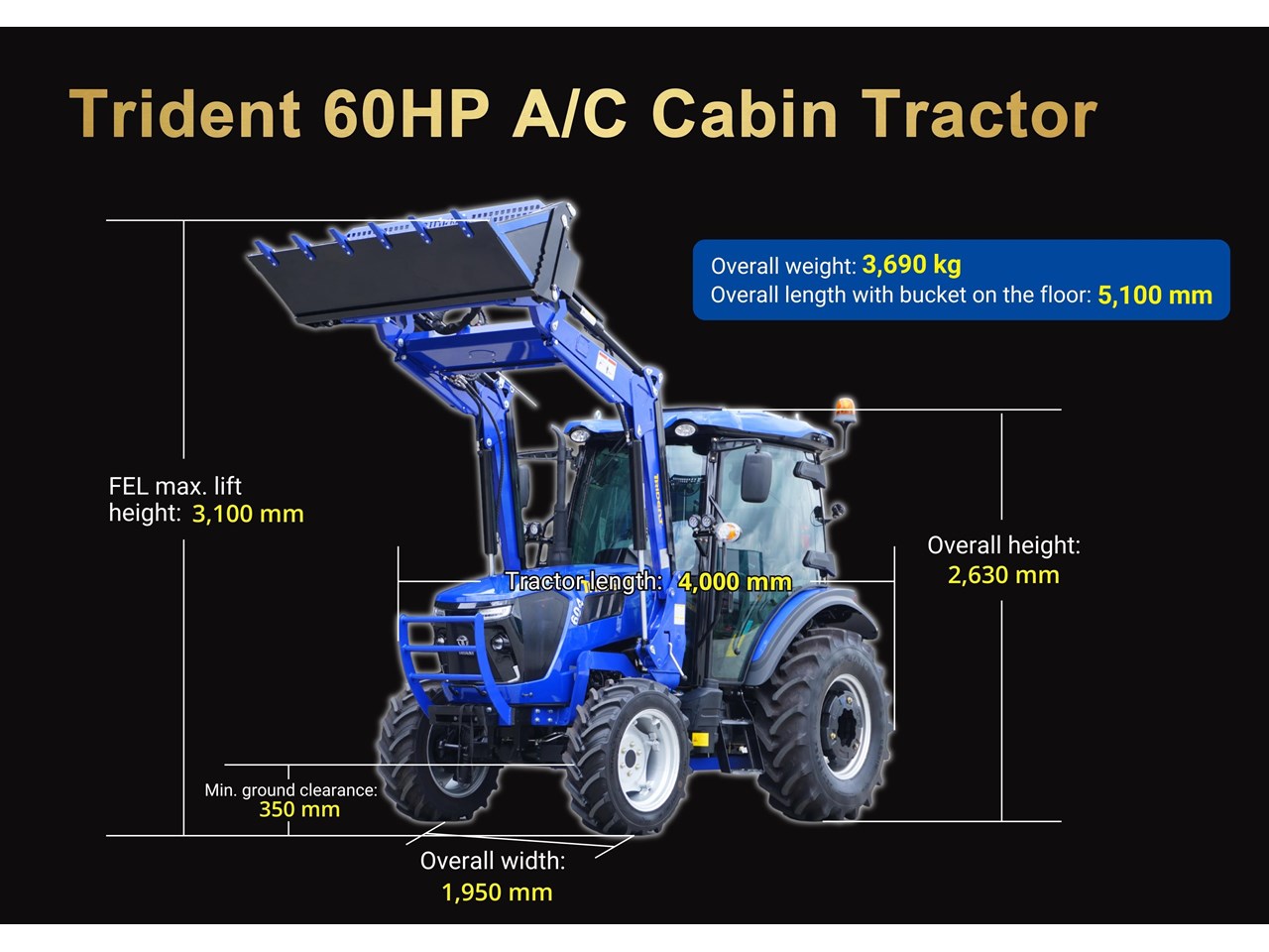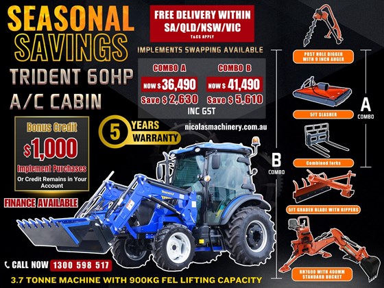 | Title | TRIDENT SEASONAL SAVINGS 60HP 4WD A/C CABIN TRACTOR WITH 4IN1 BUCKET COMBO DEAL 5 YEARS LABOUR AND PARTS WARRANTY AUSTRALIA WIDE DELIVERY & SUPPORT |