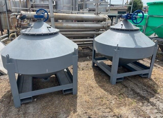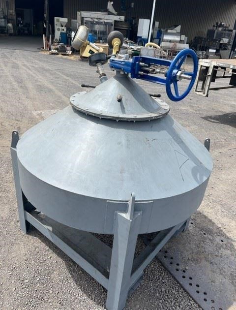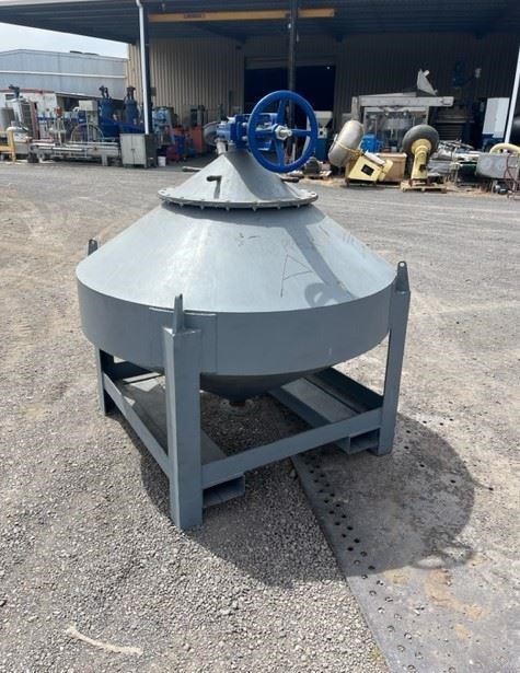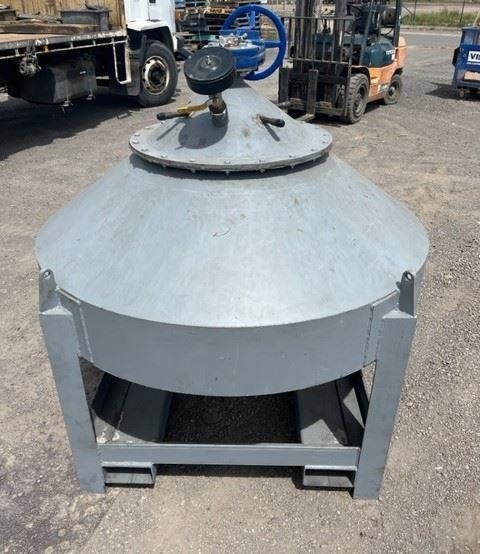 Mild steel hopper, last used for sand. Approx 750 lt capacity 1.5m dia x 250mm straight side x 500mm cone on top and bottom. 2 inch gate valve at the top. Forklift pockets. 2 available, price per hopper.